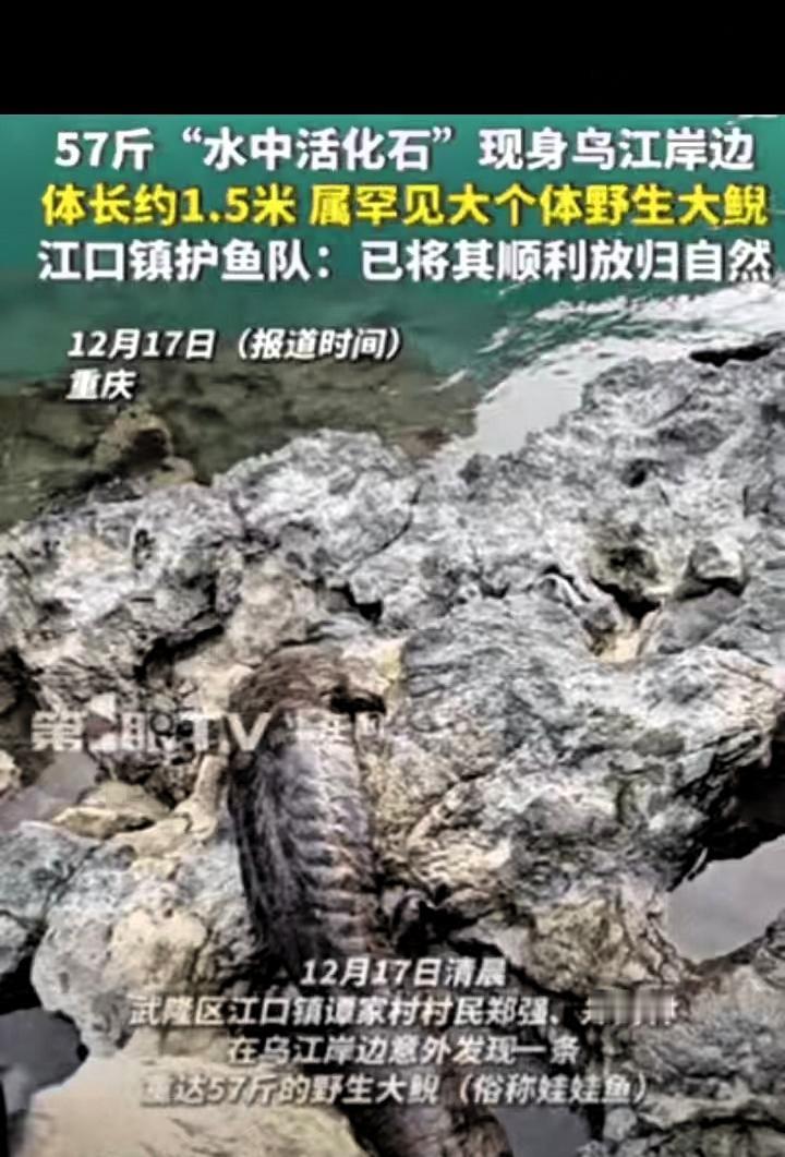 “幸亏发现及时!”重庆一村民干活时,突然发现石头缝有动静,他第一反应以为是山里的毒蛇,吓得往后退了两步,攥着锄头不敢靠近。 缓过神后,他捡起树枝小心翼翼拨开杂草,凑近一瞧才发现,这是一条浑身皱巴巴的野生大鲵。 这位大哥反应很快,立马喊来旁边干活的邻居,几个人围着石头缝守着,谁也不敢随便触碰。他记得村里大喇叭经常宣传保护野生动物的内容,知道这东西肯定不一般,要是伤着或者被人带走,后果可能很严重。 没过多久,民警和林业部门的工作人员就赶到了,他们用专业网兜将大鲵捞出来称重,足足有57斤,体长约1.5米,在场的人都十分惊讶。 野生大鲵是国家二级保护动物,俗称娃娃鱼,对生存环境要求极高,只能在清澈低温的山泉溪流里存活,堪称水质的“晴雨表”。 它能在这片山林现身,足以说明当地的生态环境保持得很不错。更让人佩服的是这位村民,面对这种罕见的野生动物,没起半点贪念,也没有盲目上手,仅凭朴素的保护意识就守住了它。 野生大鲵生长速度很慢,一年大概只长一两斤,一条57斤的大鲵,需要在无污染的环境里安稳存活二三十年才能长成。那些偷捕贩卖野生大鲵的人,不仅触碰了法律红线,更是在破坏当地的生态链。 现在这条大鲵已经被送到救助站,待检查无碍后就会放归自然。其实保护野生动物并不难,遇到不认识的稀罕物种,做到不碰、不惦记,第一时间联系相关部门就够了。