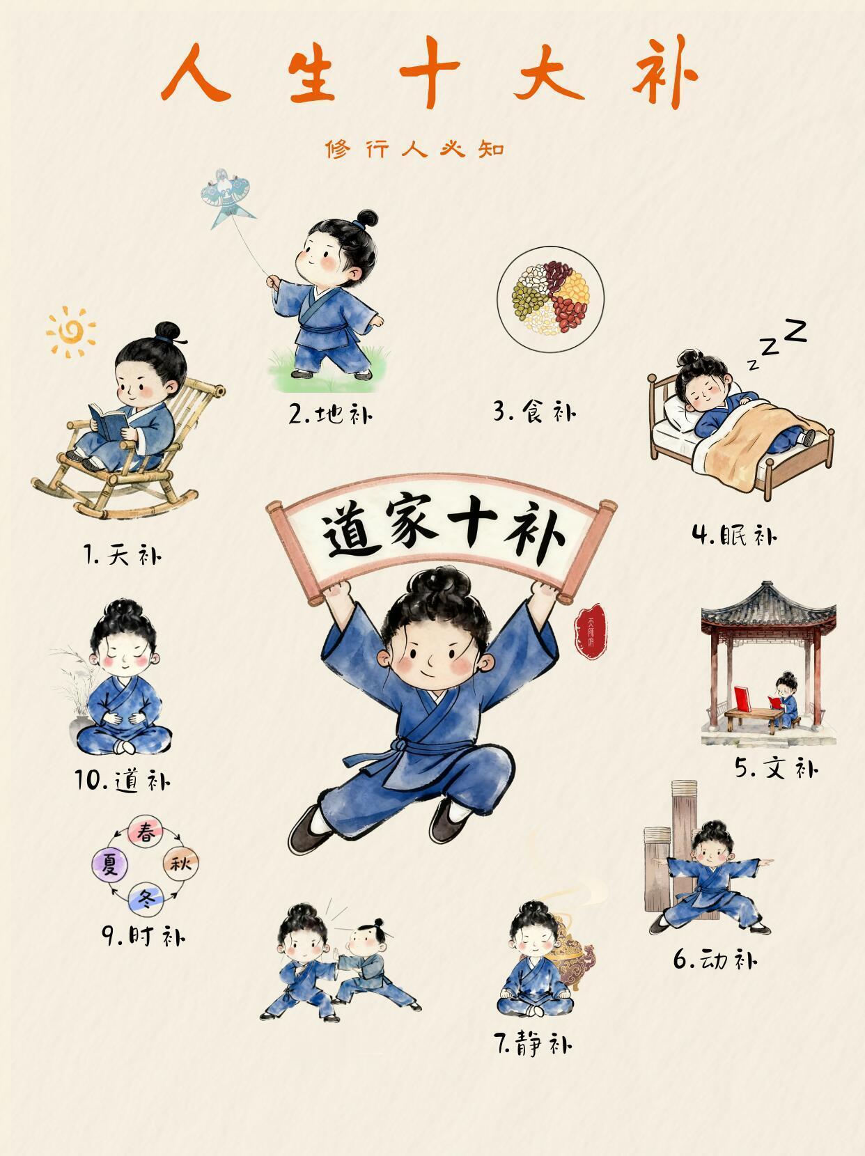 道家十补你都知道吗?🍃“人生于天地,悬命于天,天地合气,命之曰人。”《黄帝内经》 短短一句话,道破了生命的本质。 生命,从来不是孤立的个体,而是与天地自然和谐统一的存在。 世间万物皆有能量,我们的养生之道就藏在这“人生十大补”中。
