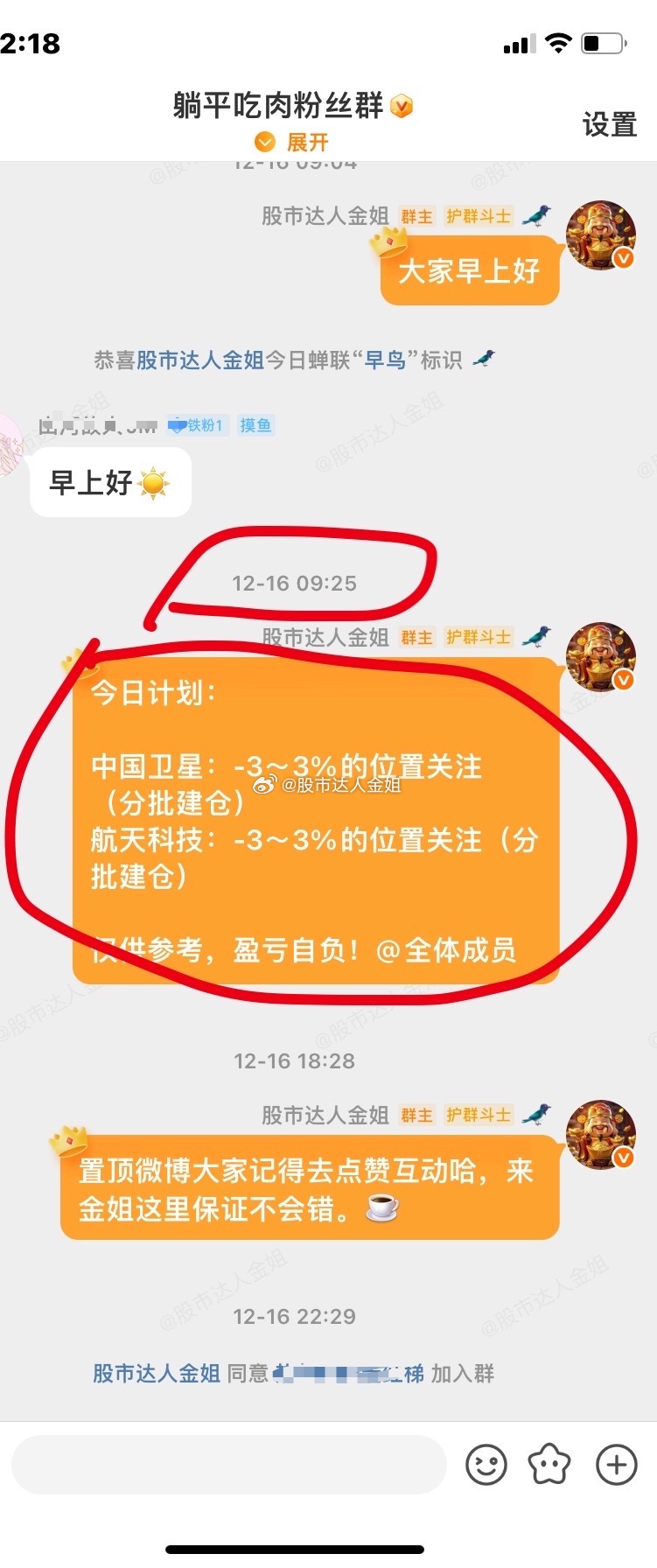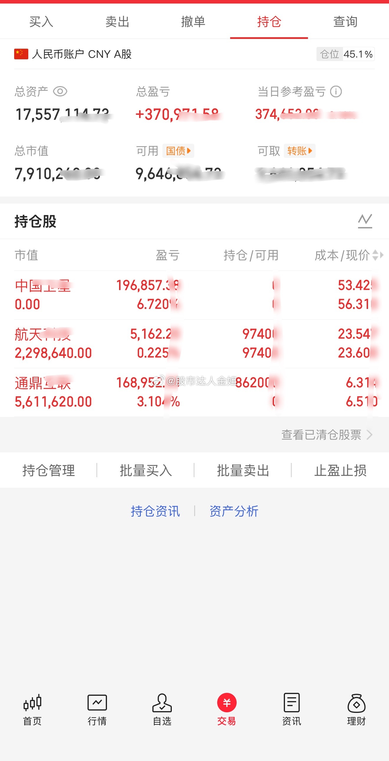 今日收盘,每天坚持更新持仓,欢迎同学们见证翻倍!今日早盘介入了,通鼎互联,金姐粉丝群开盘就提示了,可惜尾盘开版没能封住,明天是肉还是面呢?今日金姐止盈了中g卫星,开版没能回封,落袋为安,剩余航天科技持有不动。特别声明:以上内容是本人的个人交易计划,不构成任何投资建议,请勿跟风操作,盈亏自负,股市有风险,入市需谨慎。