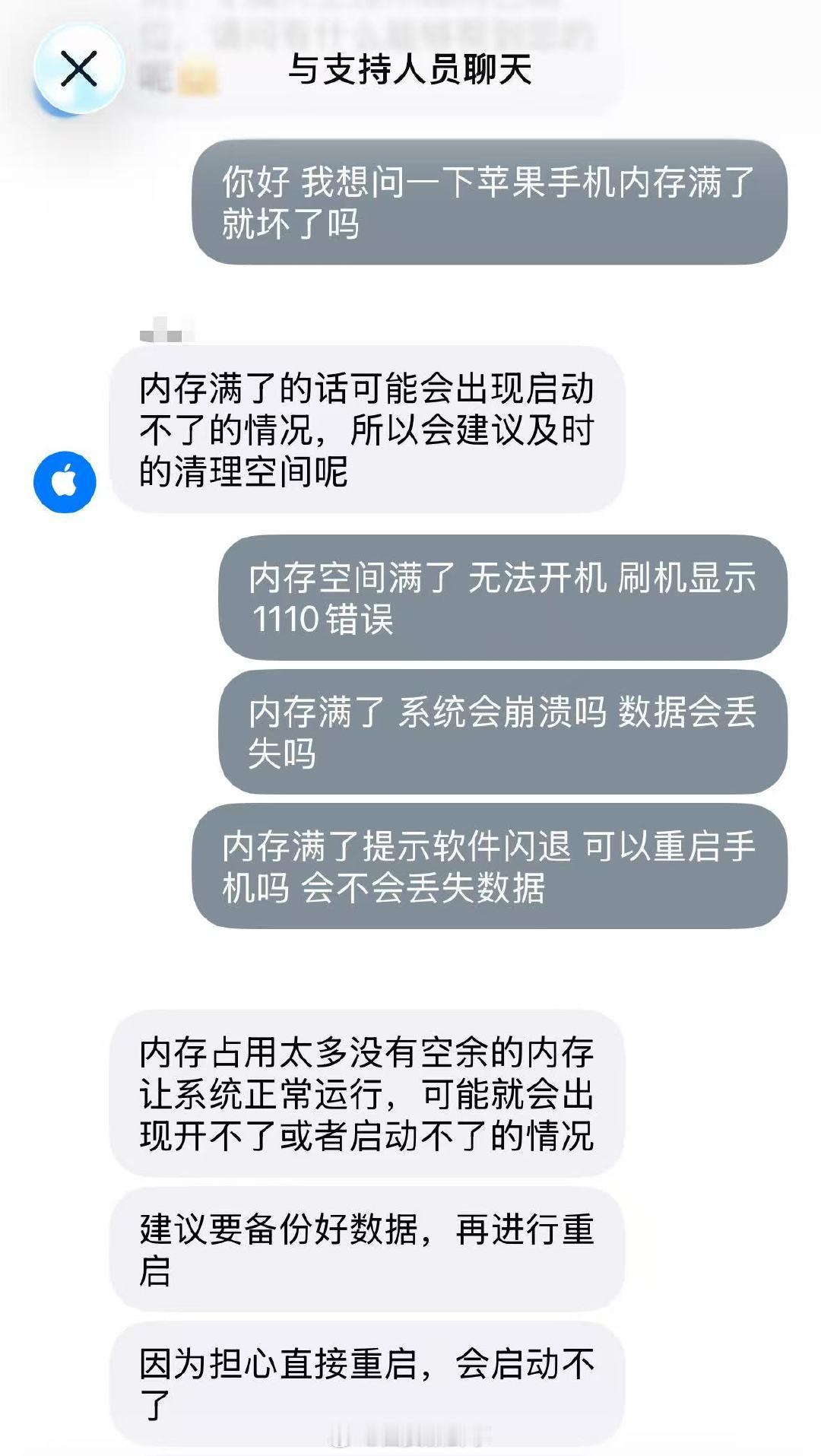 【苹果客服回应iPhone内存用完就坏了】苹果客服回应iPhone不能把内存用完12月18日,iPhone千万不能把内存用完登上热搜。有网友分享使用苹果手机内存满了无法开机,刷机显示1110错误。还有网友评论称IOS系统内存满了,小心系统崩溃,会无法保存数据。对此,苹果客服回应称:内存占用太多没有空余的内存让系统正常运行,可能就会出现开不了或者启动不了的情况,所以建议及时清理空间。内存太满,提示闪退的话,建议要备份好数据,再进行重启。手机可以正常进去的话,可以先把手机连到电脑上面备份一下,备份好了之后再进行其他的操作,比如说删除数据或者是恢复出厂设置。