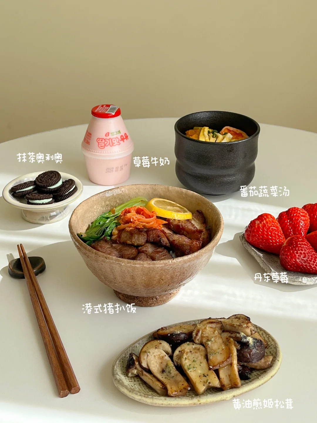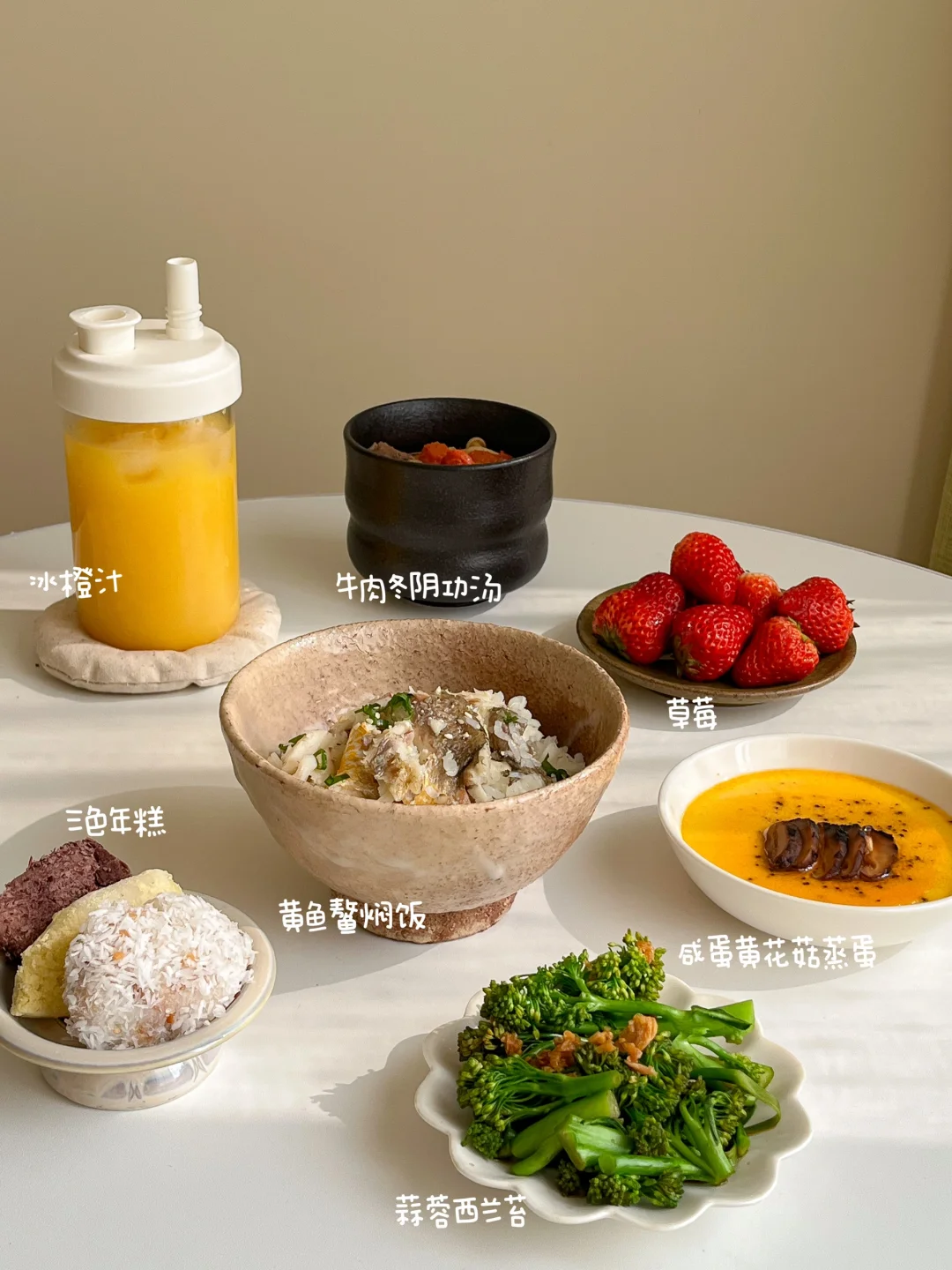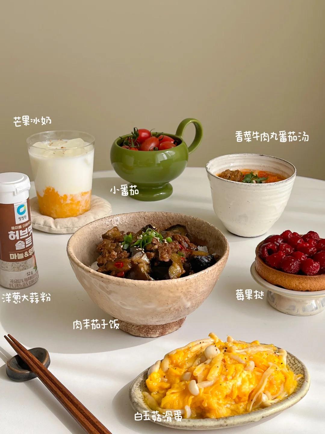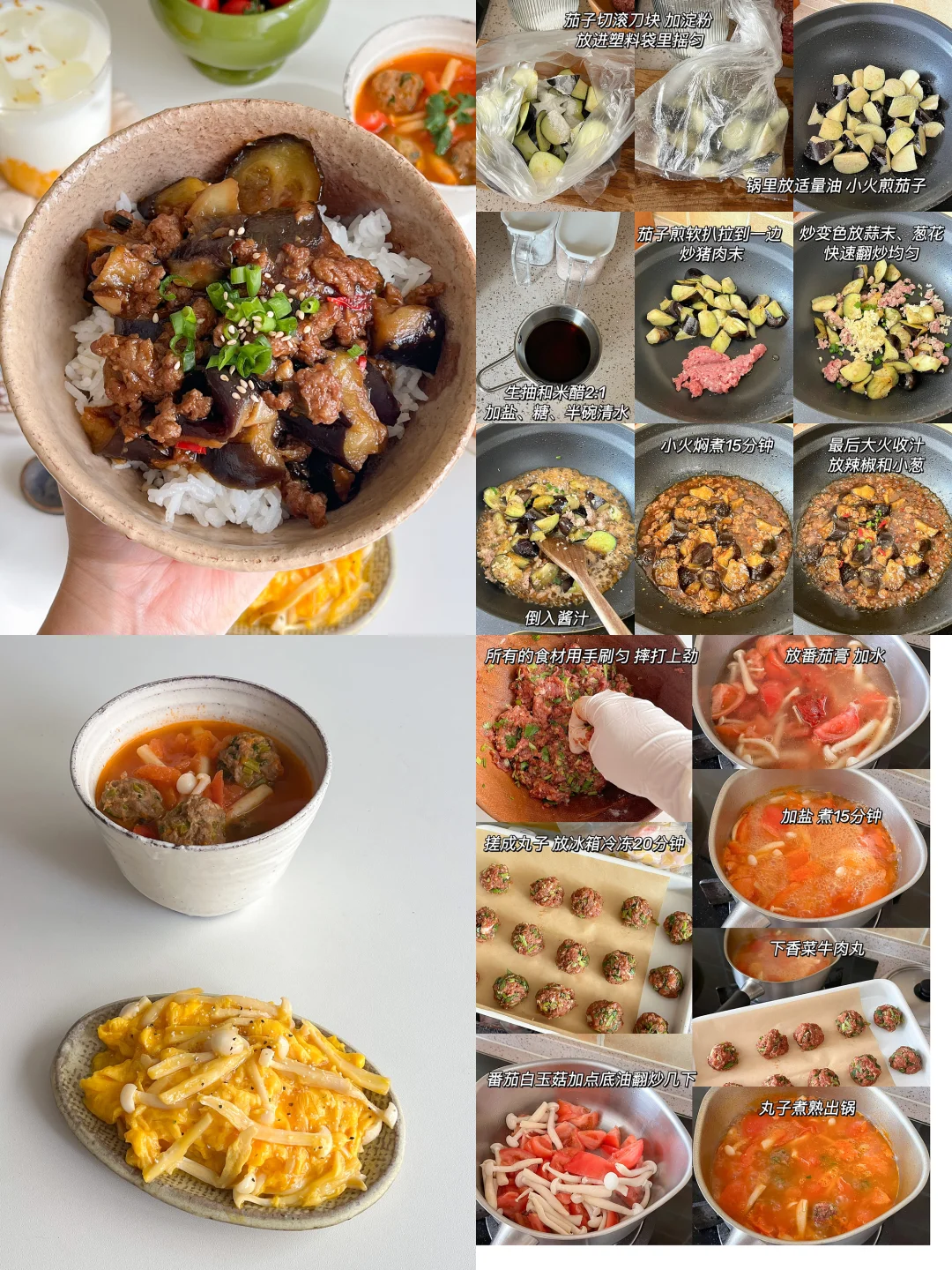 在休息的日子里 每天都有好好吃饭[派对R] 肉末茄子饭🍆 香菜牛肉丸番茄汤🍅 白玉菇滑蛋🍳 莓果挞🥧 芒果冰奶🍨 港式猪扒饭🍱 番茄蔬菜汤🥣 黄油煎姬松茸🧈 草莓牛奶🍓 黄鱼鳌焖饭🐟 蒜蓉西兰苔🧄 咸蛋黄花菇蒸蛋🍄 牛肉冬阴功汤🌶 冰橙汁🧃 山楂糖醋排骨饭🍖 三鲜蔬菜汤🎍 清炒豌豆苗🌱 醋泡黑豆🫘 莓果酒酿酸奶🍧