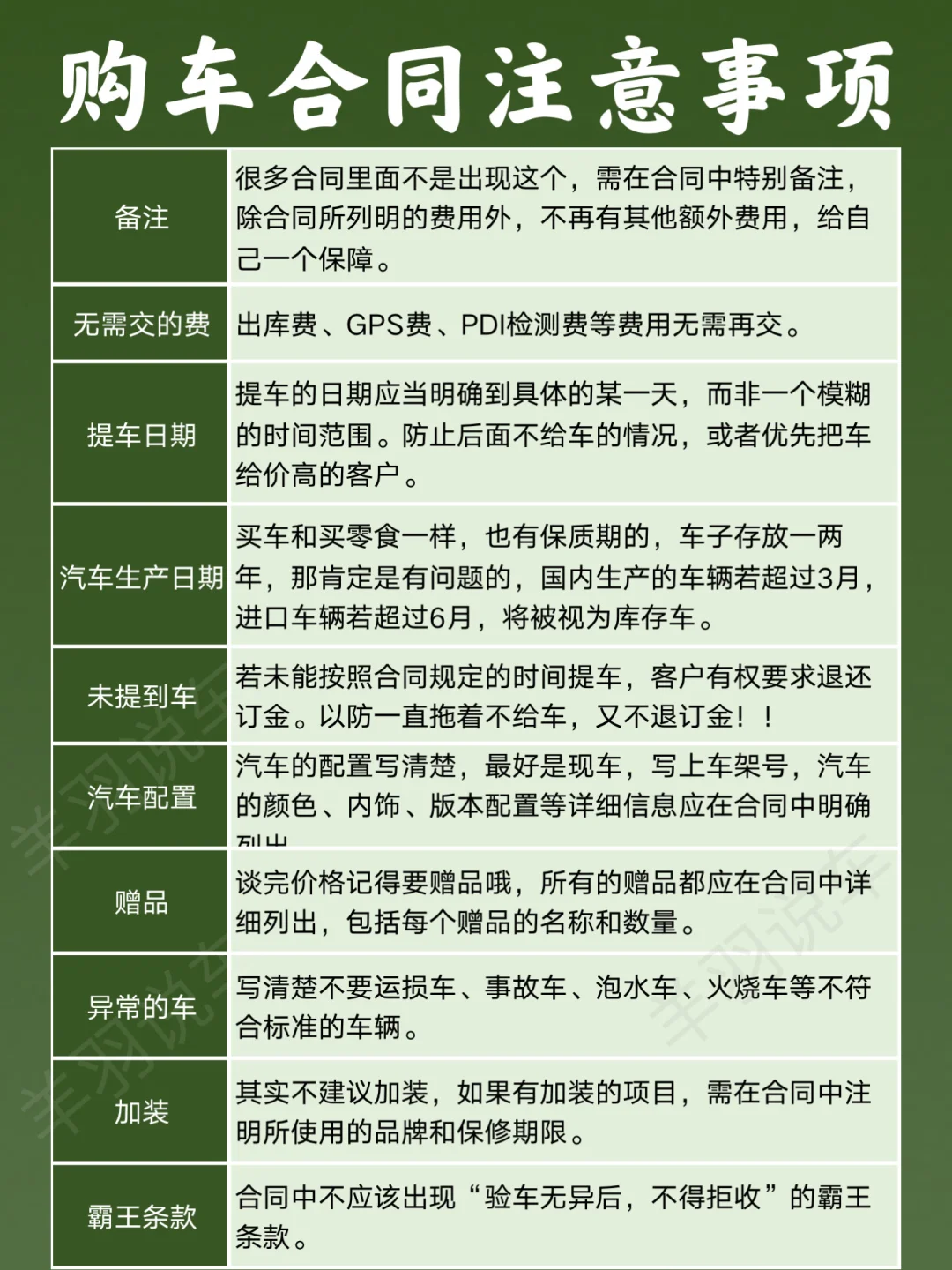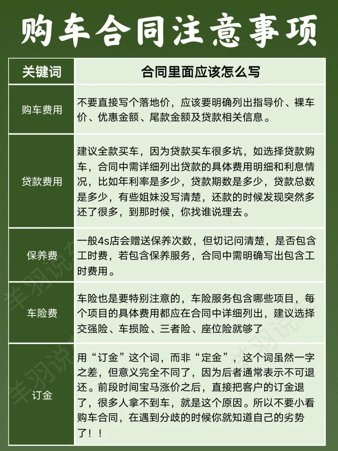 建议全款买车,因为贷款买车很多坑,如选择贷款购车,合同中需详细列出贷款的具体费用明细和利息情况,比如年利率是多少,贷款期数是多少,贷款总数是多少,有些姐妹没写清楚,还款的时候发现突然多还了很多,到那时候,你找谁说理去。