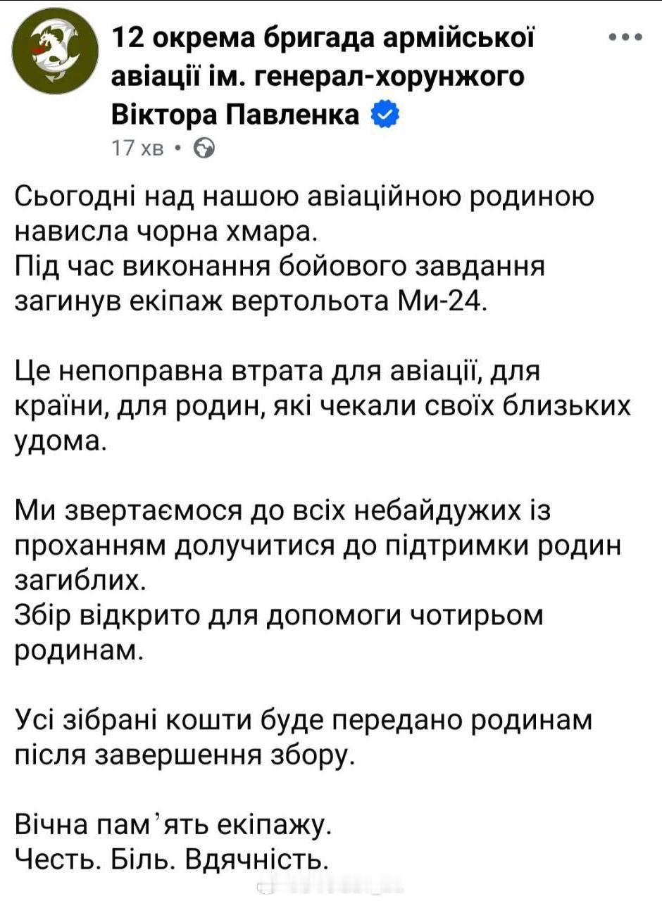 乌军第12独立陆航旅宣布今天在作战行动中损失一架米-24直升机,4名机组成员阵亡