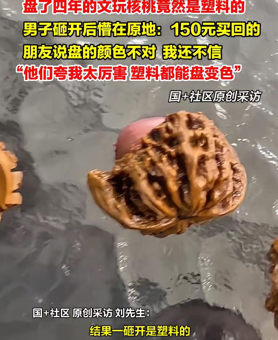 伤害性不高侮辱性极强!河北唐山,男子盘了四年文玩核桃,结果给朋友展示时,对方一眼就指出他这个有问题,一开始男子还不信,结果砸开一看,才发现是塑料的,盘了四年就算了,当初他还花了150块钱购买的 谁能想到啊,这颗被唐山大哥视若珍宝的“文玩核桃”,竟是块不值钱的塑料疙瘩!四年时间,一千四百多个日夜,他每天雷打不动的两件事:早上出门前盘十分钟,指尖蹭着“核桃”的纹路找手感;晚上睡前摩挲半小时,看着表面被盘出的“包浆”傻笑,连出差都得用小布包裹着带在身上,生怕磕着碰着。他总跟身边人念叨,这核桃是“缘分货”,当年在集市上一眼相中,老板说是什么“狮子头”品种,皮质紧实、纹路清晰,盘好了能升值,他咬咬牙花150块买下,那可是十几年前的150块,够一家人半个月的菜钱了。 大哥不是没怀疑过这核桃的不对劲。盘了一年多,它既没像正经文玩核桃那样变色均匀,也没透出自然的油脂光泽,反而越盘越“亮”,那种亮得发假的塑料质感,他当初只当是自己盘玩手法不到位,还特意上网查了“盘核桃技巧”,学着用猪鬃刷清理纹路,用橄榄油保养,折腾来折腾去,愣是没发现问题出在“材质”上。直到那天约朋友喝酒,酒过三巡拿出核桃炫耀,朋友接过手掂了掂,又用指甲刮了刮纹路,眉头一皱:“哥,你这核桃不对劲啊,分量太轻,纹路摸着手感发滑,不像是木头的。” 大哥当场就急了,拍着桌子反驳:“不可能!我盘了四年了,怎么会是假的?”朋友也不争执,只说:“你要是不信,找个硬物砸开看看,真核桃砸开是木质纹理,假的一砸就露馅。”大哥半信半疑,找了块砖头,闭眼狠砸下去——“咔嚓”一声,核桃碎成两半,里面根本没有文玩核桃该有的果仁,只有一堆白色的塑料碎屑,连点木头的影子都没有。看着那堆碎塑料,大哥愣在原地半天没说话,脸上的得意劲儿瞬间垮了,又气又笑:“合着我这四年,天天盘的是个塑料玩具?” 这事看着好笑,背后藏着的却是文玩市场里由来已久的乱象。根据某电商平台2024年的消费投诉数据,文玩类假货投诉量占比高达23%,其中塑料仿核桃、树脂仿手串占了近六成,很多受害者都是像唐山大哥一样的普通玩家。这些假货的造假成本极低,一颗塑料核桃的生产成本不到5块钱,商家却能翻几十倍卖给不懂行的人,抓住的就是新手“想捡漏、爱面子”的心理——总觉得花小钱能买到好货,盘出来能在朋友面前炫耀,却忘了“一分钱一分货”的基本道理。 更让人无奈的是,文玩鉴别本就需要专业知识,普通玩家很难分辨真假。正经的文玩核桃,分量沉、纹路自然、表面有细微的毛孔,盘玩时会随着时间慢慢变色,从浅黄到深红再到紫黑,包浆是岁月沉淀出的温润光泽;而塑料仿品,分量轻、纹路呆板,用指甲一划就可能留下痕迹,盘玩再久也只是塑料本身的反光,毫无质感可言。可对于新手来说,这些区别根本看不出来,商家再编几句“稀有品种”“老料打磨”的谎话,很容易就让人上当。 唐山大哥的遭遇不是个例。前阵子还有网友分享,自己花800块买了串“海南黄花梨”手串,盘了半年才发现是染色的紫檀柳;有人花500块买了对“官帽核桃”,结果被懂行的人指出是树脂压模的,连纹路都是一模一样的复刻版。这些假货不仅骗了钱,更伤了玩家的感情——文玩的价值本就在于“盘玩的过程”,那种看着物件在自己手中慢慢变化的成就感,是金钱买不来的,可一旦发现自己精心呵护的“宝贝”是假货,那种失落感,比丢了钱还让人难受。 其实避免买到文玩假货,说难也不难。首先别贪便宜,低于市场合理价格的“好货”,大概率是陷阱;其次要找靠谱的渠道购买,尽量选择有鉴定证书、支持退换货的商家;最后如果自己不懂行,就别盲目跟风,先花时间学习相关知识,或者找懂行的朋友帮忙把关。毕竟文玩是用来修身养性的,不是用来交“智商税”的。 各位读者你们怎么看?欢迎在评论区讨论。