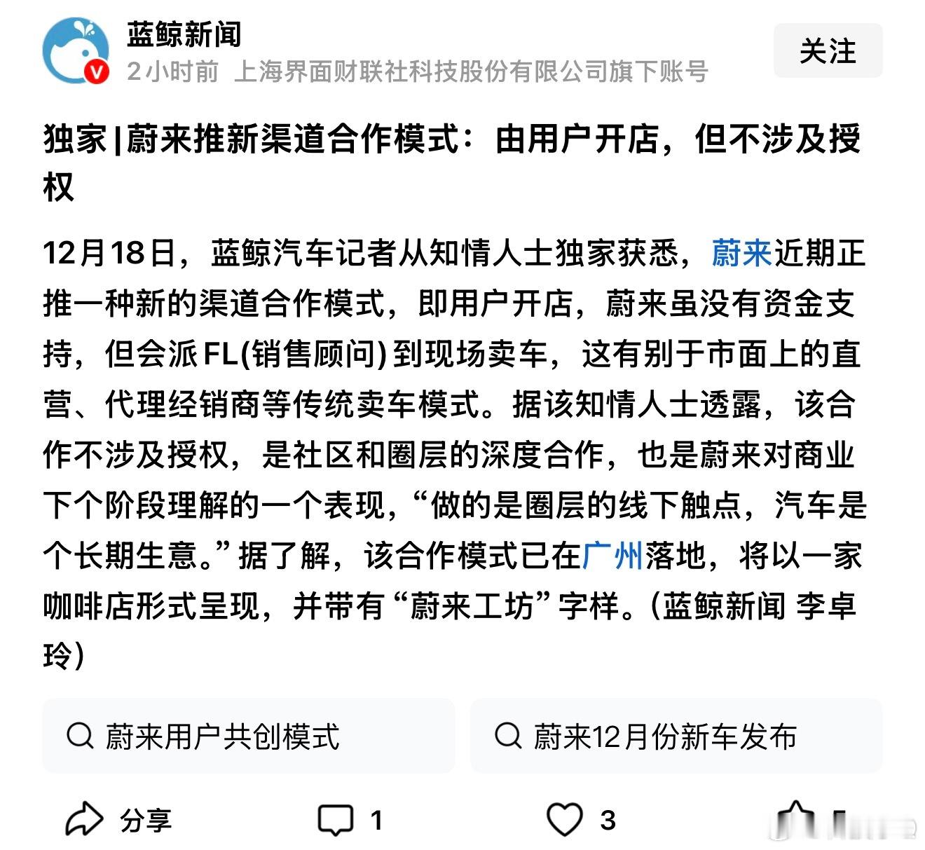 蔚来推新渠道合作模式:由用户开店,但不涉及授权…看完感觉有没有点儿当初米家那个合伙人模式?这是要把社群完成展销模式?多点开花,节省成本?那是不是直接上电商平台更好一些?
