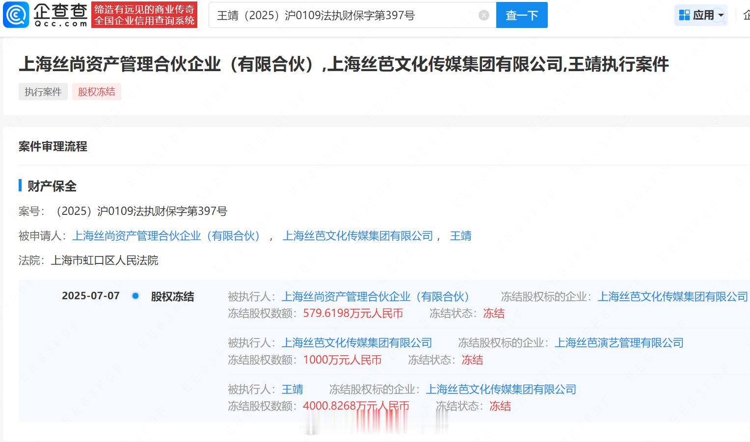 【丝芭董事长4000万股权被冻结】丝芭董事长关联公司注销过半12月17日,鞠婧祎工作室严正指控丝芭传媒“伪造协议、骚扰合作方”,而丝芭传媒则迅速回击,列举出鞠婧祎获得税前过亿的优渥待遇,反指艺人方说法严重失实。丝芭董事长成被执行人企查查APP显示,丝芭董事长王靖名下关联25家企业,其中15家已注销,10家为存续在业状态,包括上海丝芭影视有限公司、上海丝芭文化传媒集团有限公司等,涉及文化、体育和娱乐业等领域,王靖在上述企业担任执行董事兼总经理、董事长等职务。今年7月,王靖所持上海丝芭文化传媒集团有限公司约4000万股权已被冻结,冻结日期自2025年7月7日至2028年7月6日。