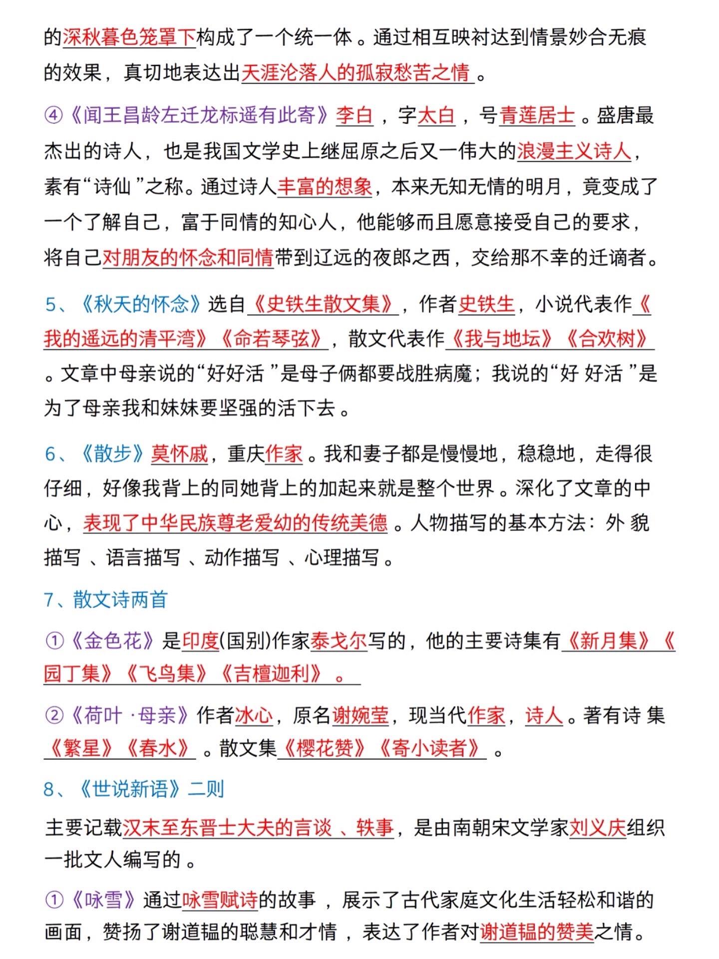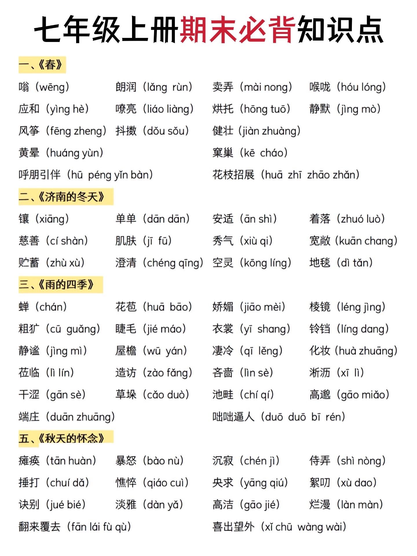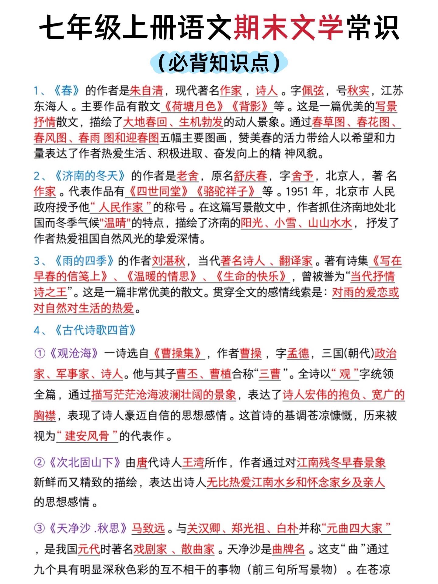 七年级上册期末考试全册复习重点必背常考。七年级上册语文知识点,老师给大...
