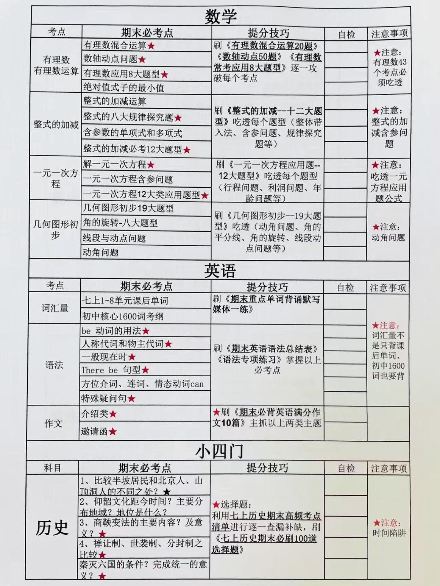 七年级上册期末复习清单如果复习一网打尽。七年级上册期末复习,老师给大家整理出来了。这份期末复习清单,可以帮助孩子轻松解决复习难题。不知道该如何复习的可以拿一份给孩子复习复习,考试稳上98➕