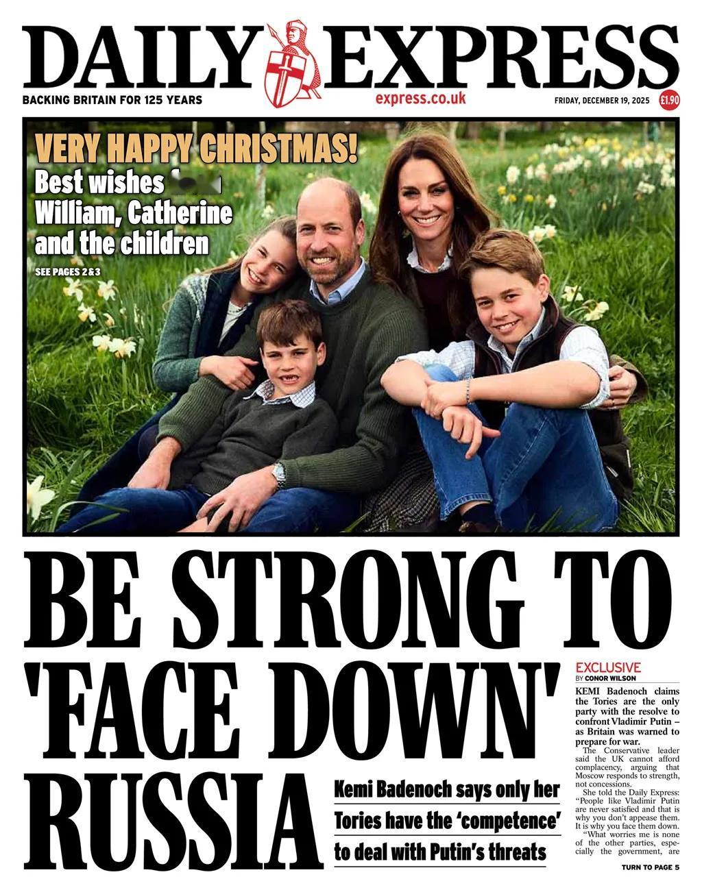 据《每日快报》报道,英国王室成员永远是英国媒体焦点,照片显示,英国皇室公布威廉与凯特以及孩子的圣诞节宣传照。 另外该报关注了,俄罗斯成为英国国内政治的“标靶”。英国保守党领导人凯米·巴德诺克表示,只有她的党有“能力”应对弗拉基米尔·普京的“威胁”。