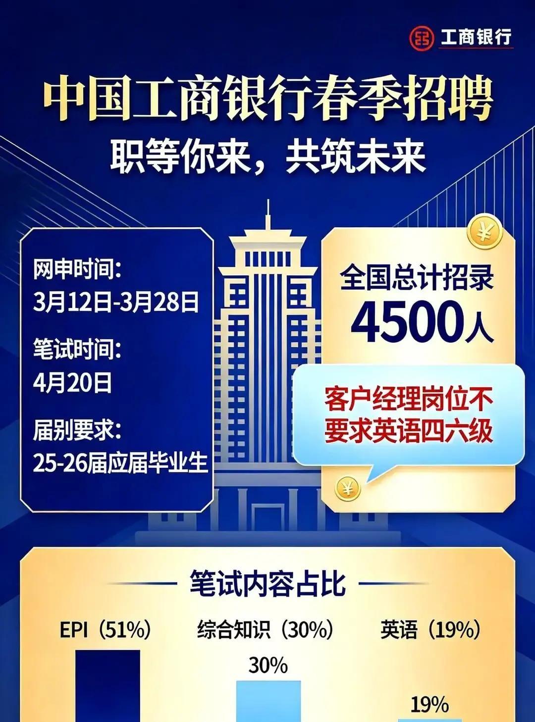 工行突然把四六级从硬杠杠里划掉,4500个岗位直接敞开。 消息一出,我群里那帮双非兄弟直接炸了锅,报名表甩得比红包还快。 笔试卷子也变脸,行测类题占一半,英语只剩两成,摆明告诉大伙:会拉客户、懂系统、能扛指标,比会背abandon管用。 去年隔壁学院一学霸,六级550,面试被问“怎么卖理财”,憋得满脸通红;这回他连夜把实习经历写成小作文,底气足得能拍桌子。 我看报道说,报名已经冲到八十万,中西部简历呼呼涨,连我妈都感慨:银行终于想起普通人家的孩子也需要吃饭。 证书墙倒了,关系户还在,可至少笔试那关能靠刷题硬刚,对小镇做题家算条活路。 门槛降了,能力说话,肯学肯干的人就有机会坐进网点柜台,把爸妈的牵挂换成稳定的工资条。