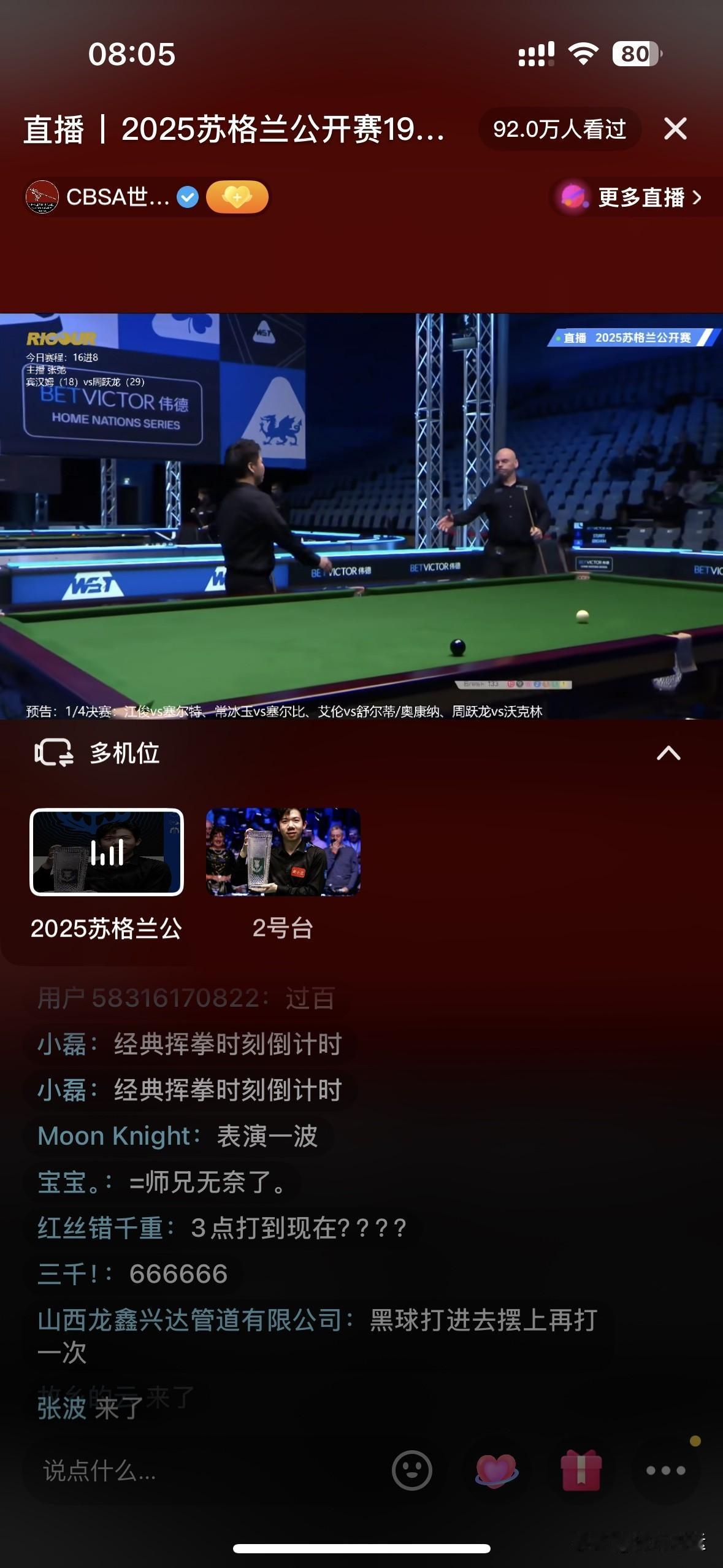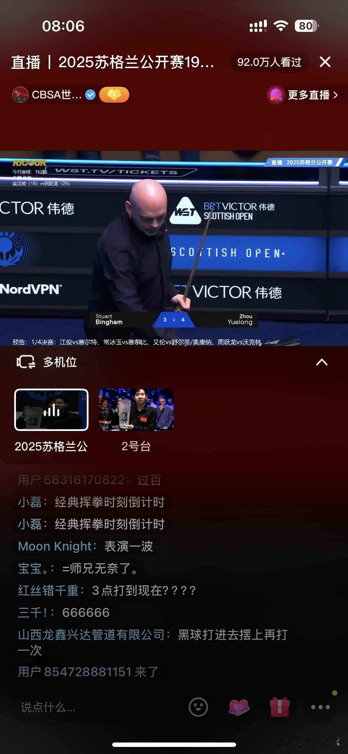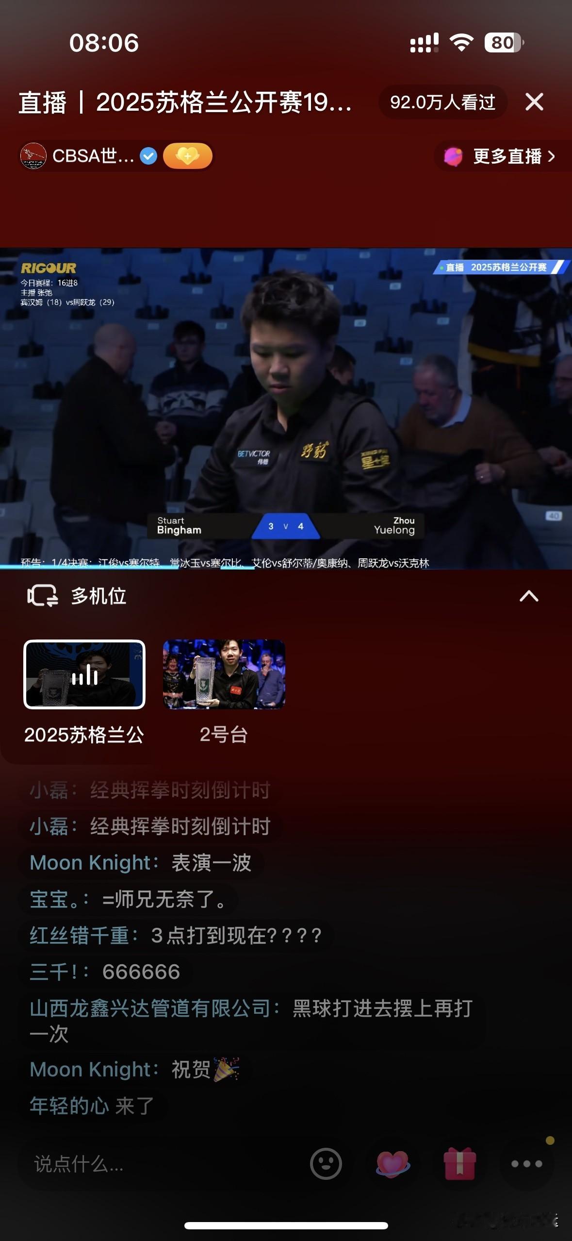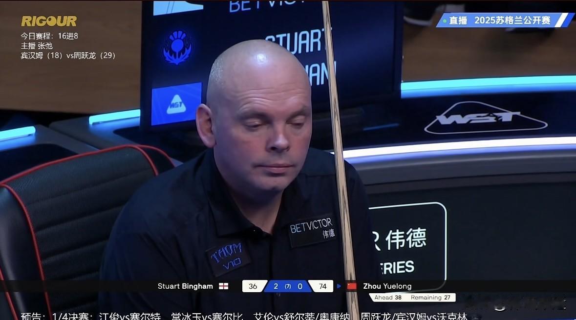 🎉🎉挥拳哥周跃龙双赛点决胜局单杆133绝杀二师兄宾汉姆锁定八强席位🔥🔥🔥 斯诺克苏格兰公开赛1/8决赛这场周跃龙与宾汉姆的对决太刺激了!12月19日凌晨这场接台赛,开场比原定稍晚,却让观众期待值拉满。 比赛开始宾汉姆2-0领先,不过周跃龙火力全开,连赢三局手握赛点。可宾汉姆也不是吃素的,挽救赛点把比分追成3-3。决胜局周跃龙稳住心态单杆133拿下比赛,成功闯入八强。周跃龙进攻天赋强、杆法细腻,但容易激动犯错;宾汉姆技术全面、球风稳定。这场比赛真是技术与心态的较量。 1/4决赛,周跃龙将对阵韦克林,后者4-2战胜袁思俊晋级! 另外,奥康纳3-2领先舒尔第,后续也很值得关注! 斯诺克赛事安排 斯诺克决赛 斯诺克盛典 斯诺克年度大奖 斯诺克逆转 斯诺克单杆清台