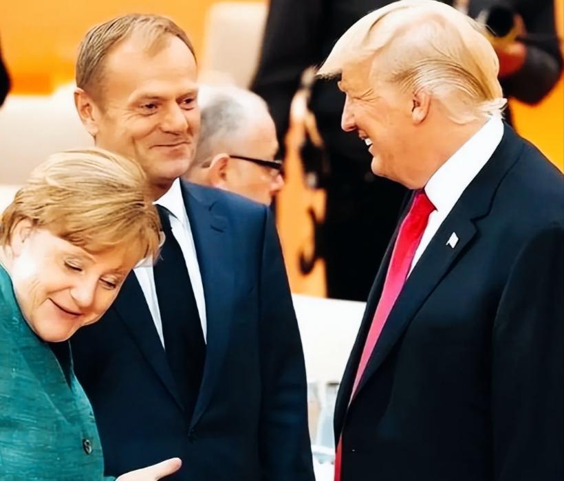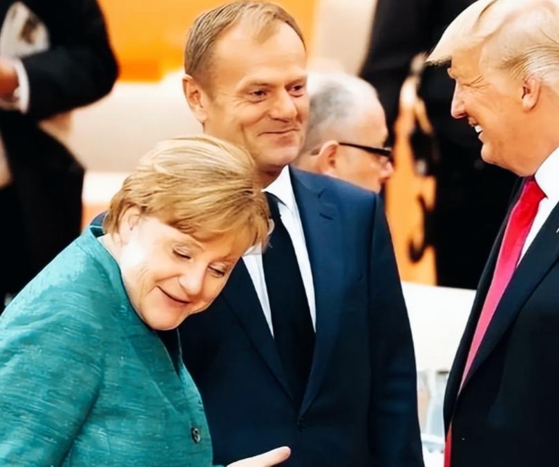 默克尔这微笑低头的姿势,像不像是有点不好意思的样子啊? 特朗普这是说了什么话,让默克尔听了都不好意思了呢? 特朗普自己倒是一脸笑容啊! 看来是把大家都给逗乐了啊!