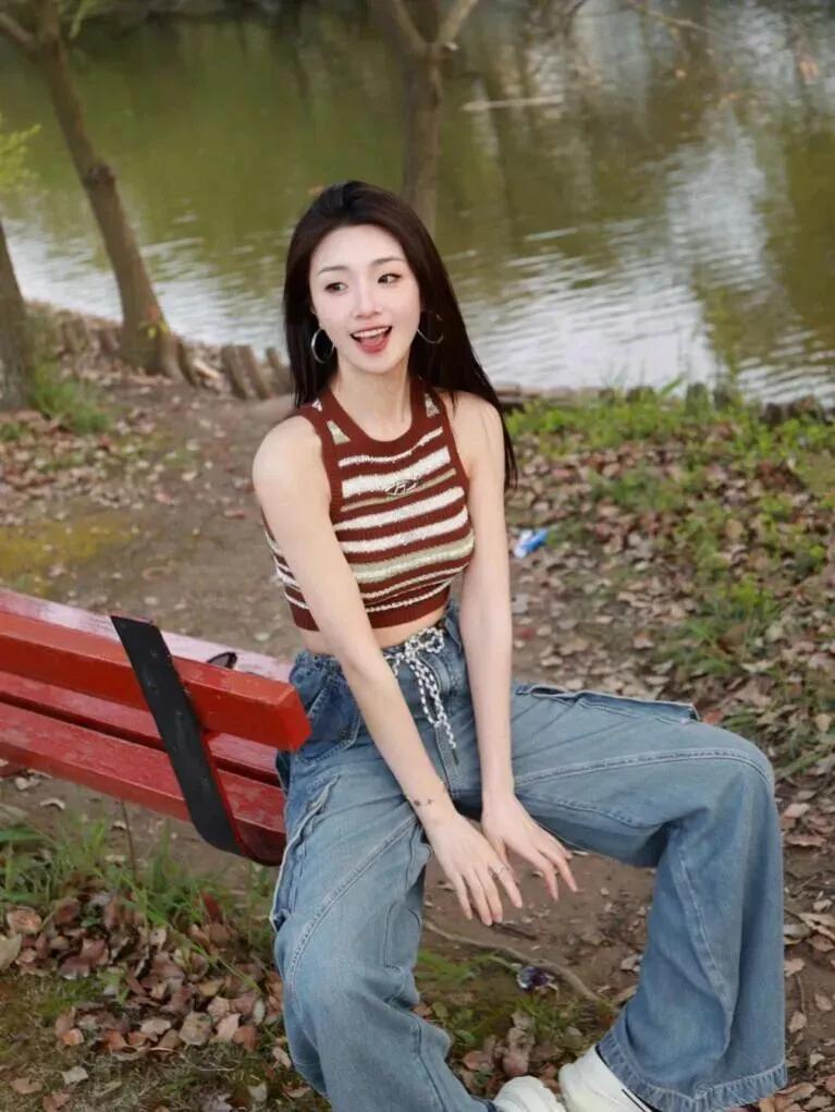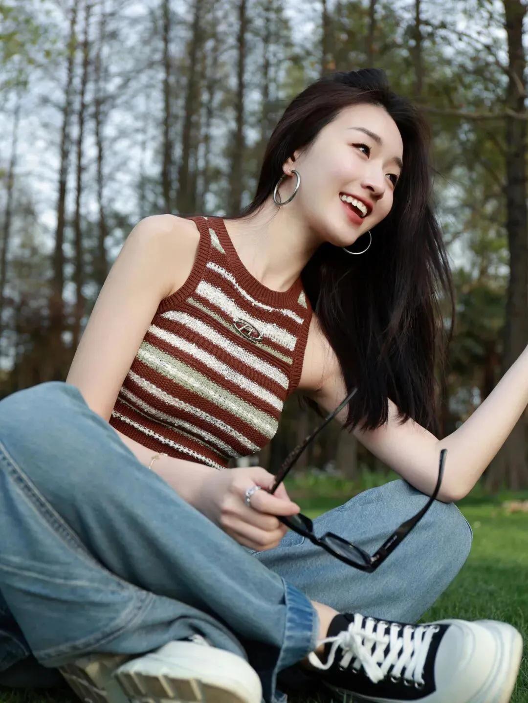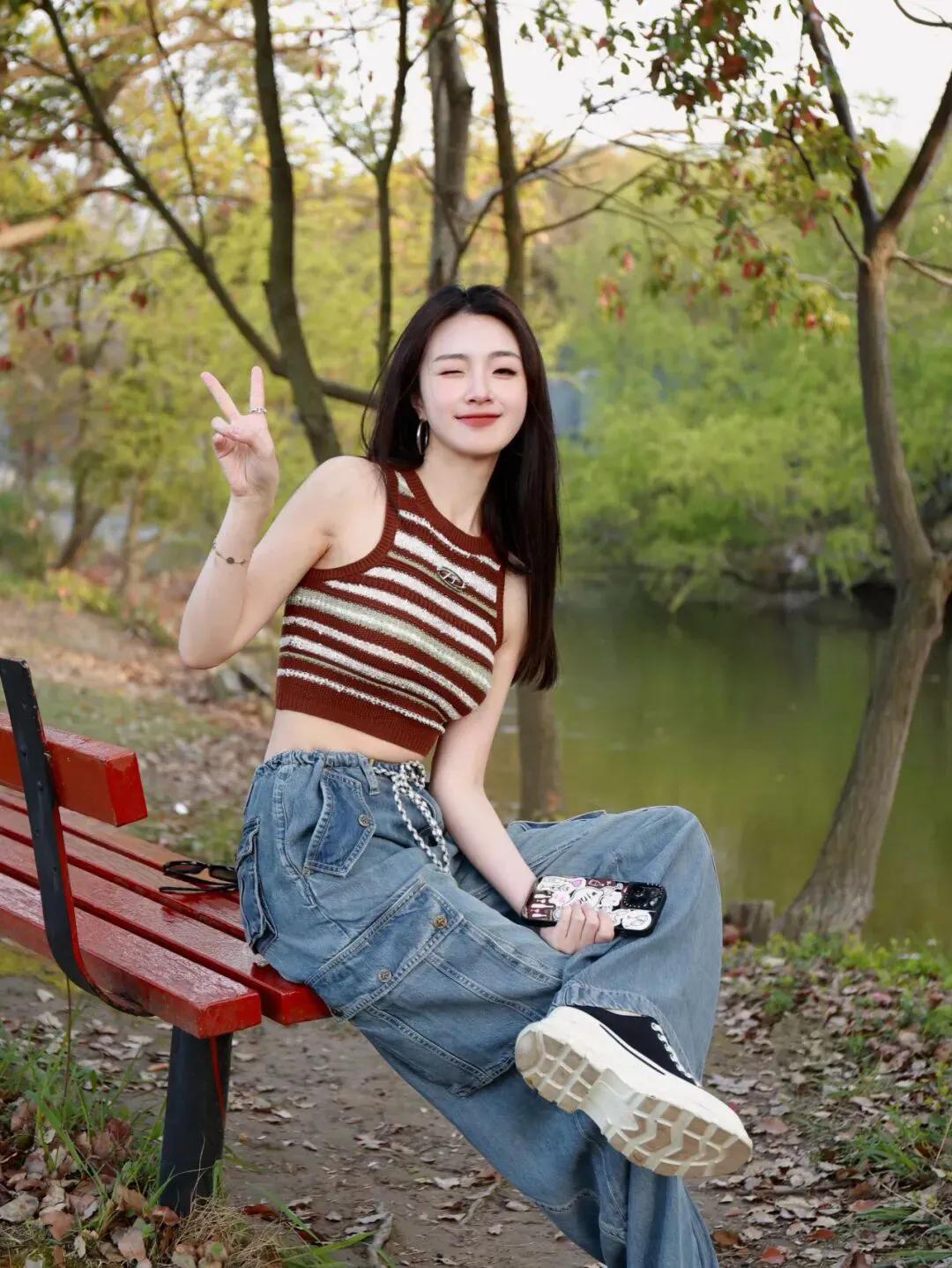 9个公园休闲风拍照姿势!条纹背心牛仔裤,轻松拿捏松弛元气感