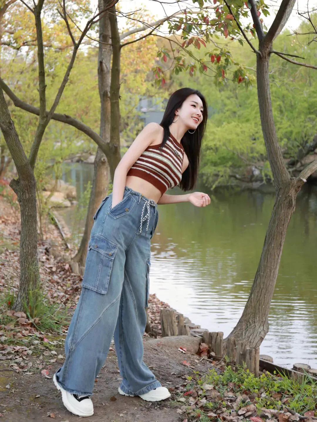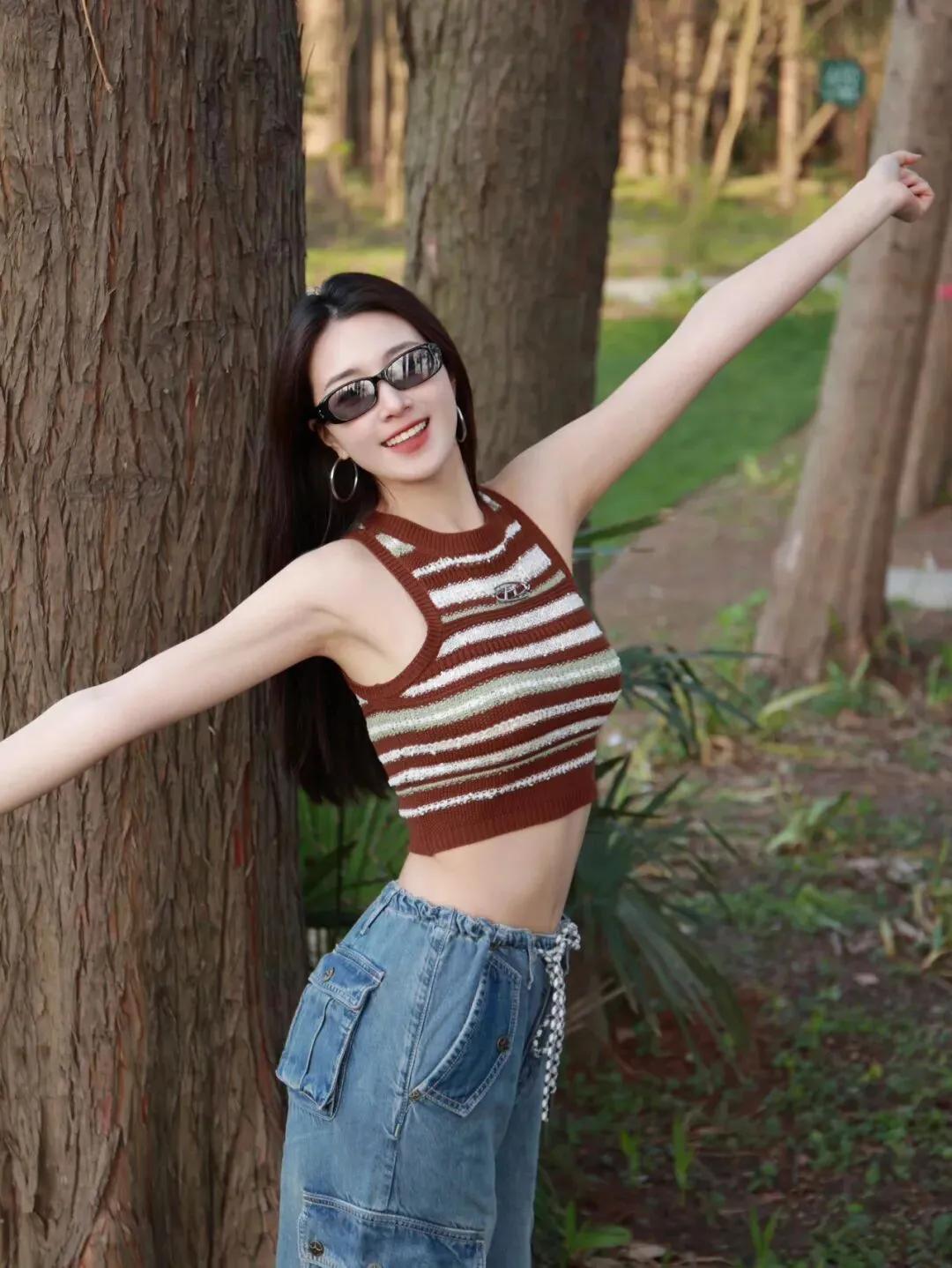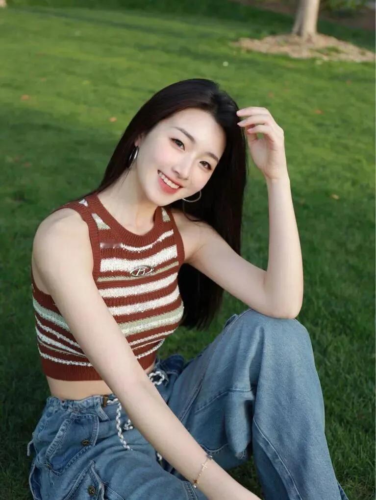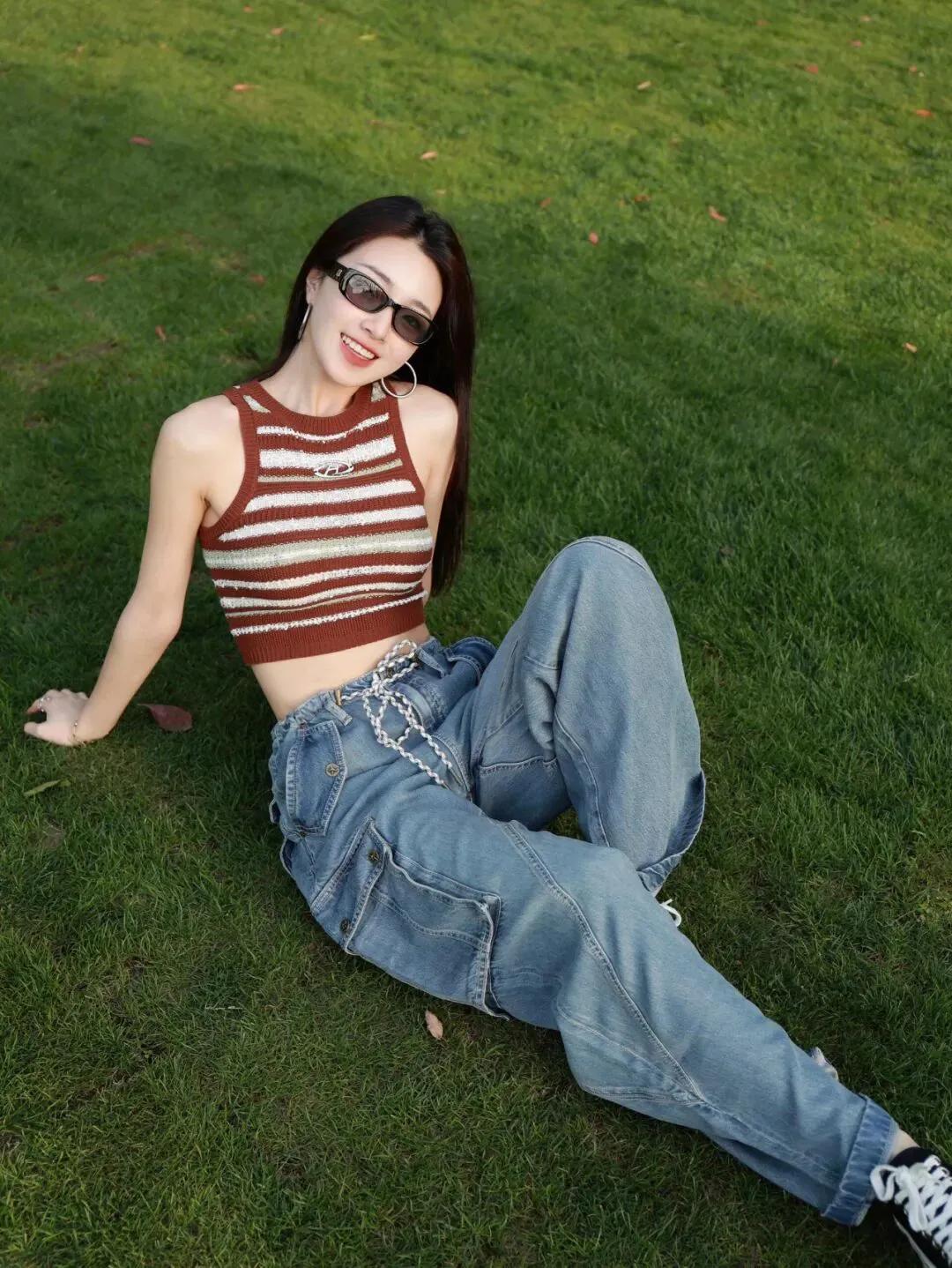 9个公园休闲风拍照姿势!条纹背心牛仔裤,轻松拿捏松弛元气感