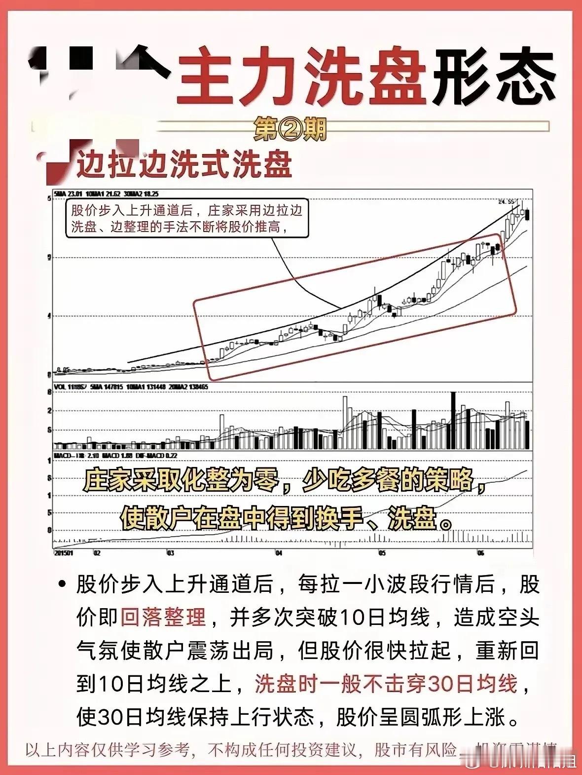 个股主升浪的两种洗盘模式 主力在完成漫长的吸货阶段、洗盘阶段后,最终进入拉升阶段的主升浪。 个股的主升浪阶段,因为个股涨幅巨大,主力也需要边拉边洗。 总结个股主升浪,主要有两种洗盘模式: 一、快速式洗盘 妖股性质的主升浪,再连续暴涨后,放出高开低走的巨量大阴线,获利盘纷纷出逃;第二天,高开高走再涨停,之后一路继续暴涨。 二、边拉边洗式洗盘 慢牛性质的主升浪,会再上涨一段时间后,就开始洗盘;洗盘一段时间后,再开始继续上涨……