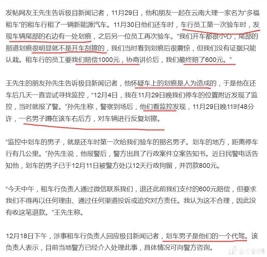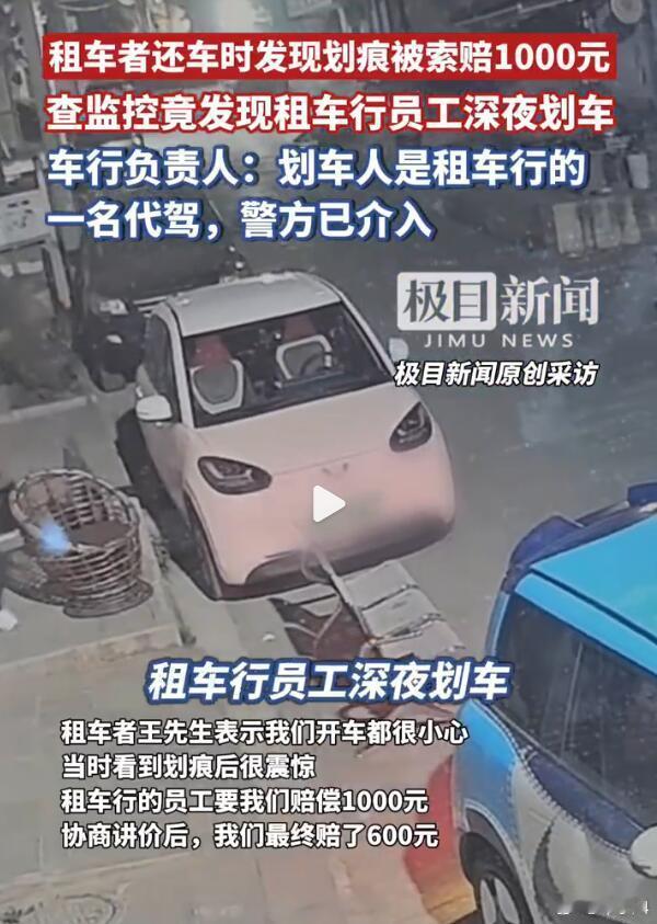 前有房东“提灯定损”,今有车行“偷摸划痕”,这种事还真不算少,很多豪车租赁就指着这种事情吃饭,如果租客没有监控之类的有力证据,恐怕还真不好脱身。所以大家在租车的时候,为了保护自己,最好在提车和还车的时候,都拍一下照片,留作证据。这种黑心商家,就该被永久禁止进入相关行业,不允许有另起炉灶的机会。想要建立一个诚信的社会,就必须让偷鸡摸狗的人付出足够大的代价。警方回应租车行员工划车向游客索赔被租车行员工划车索赔男子发声