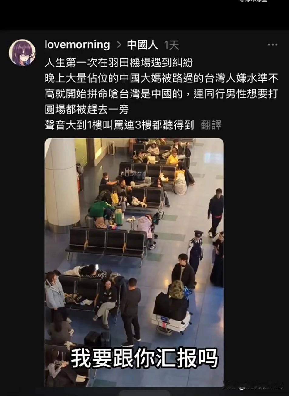 虽然这位女士声音很大,但我还是支持她,对待这群🐸就应该不留客气。 昨天在成田机场一位台湾游客对大陆女士占座心生不满,用大家都知道的腔调呛声这位女士。没想到这位女士更硬气,直接告诉他台湾就是中国的。 其实机场里占座的人很多,也有很多外国人占座。而这位🐸不敢攻击外国人,只针对大陆来的游客,这才让这位大陆游客高声呛她。 虽然这位女士声音很大,机场三层楼都能听见,但应该为她鼓掌。