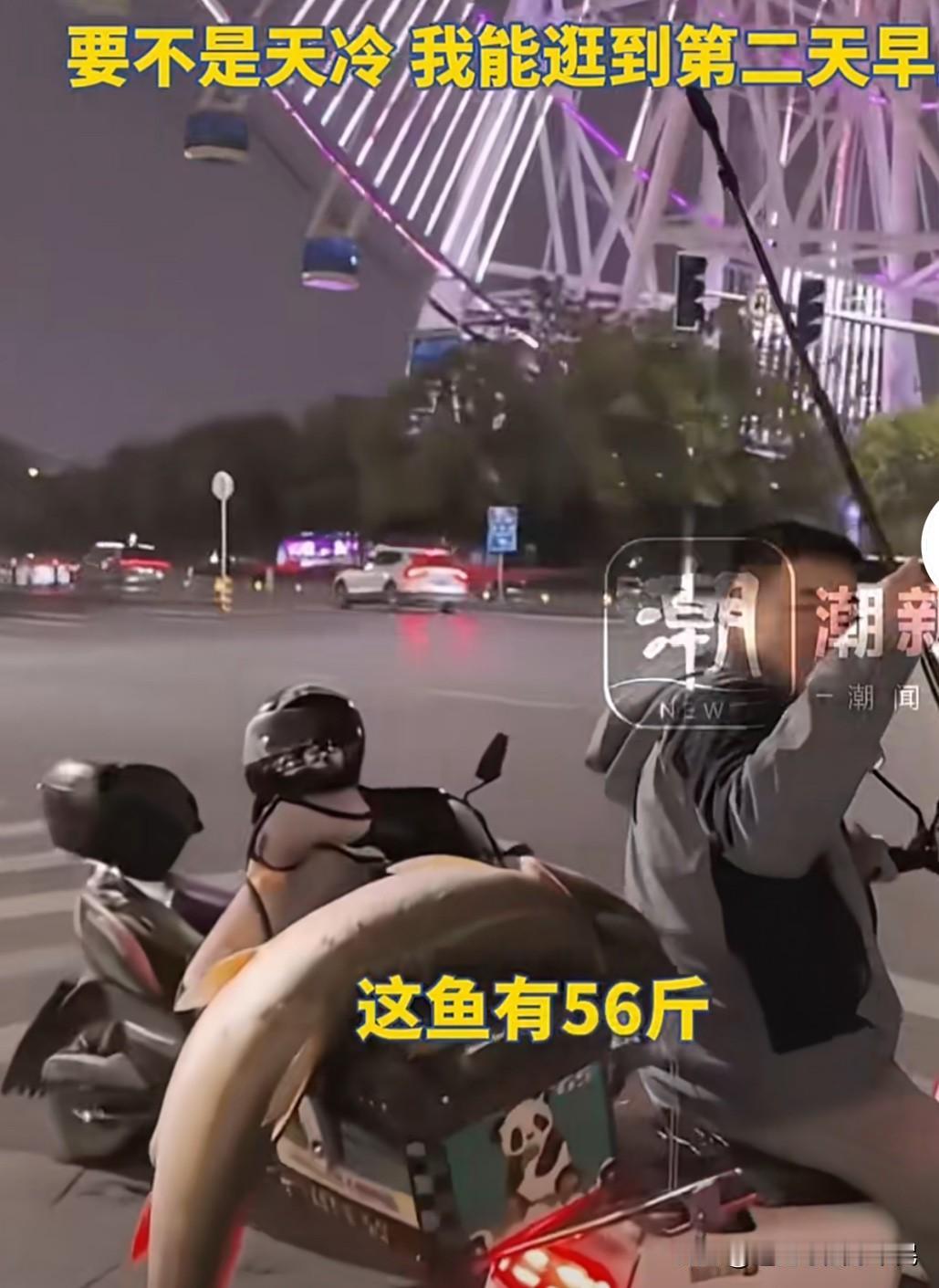 钓鱼佬的迷惑行为 哈哈哈 这位钓鱼佬钓到了一条超大鱤鱼,有56斤。把鱼绑在电动车后座上,在路上整整骑了小半天,而且是哪里人多去哪里骑。 他是下午钓到的鱼,整整在街上逛了5个小时,12点多才回家。 他说人多的地方都去转过了,要不是天气冷,他可能会在路上骑车骑到第二天早上。 钓鱼离谱行为 钓鱼界牛人