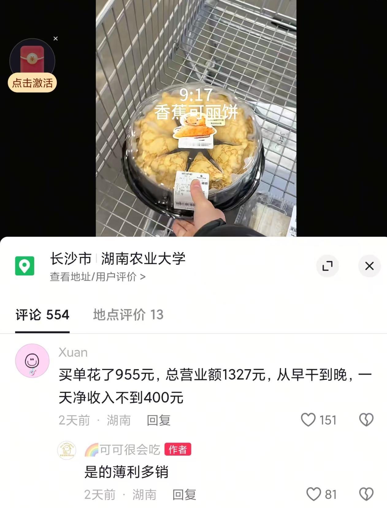 湖南一名00后女孩在大学门口摆摊卖山姆分装,声称日入1000多元,简直就是空手套白狼,但是仔细分析却发现里面的门道并不简单。 从她在社交平台发布的视频可以看出,女孩每天从超市进货,一般是小蛋糕、瑞士卷、烤鸡什么的。 山姆的货物最大的特点就是单份的量特别大,一般人买来肯定是吃不完的,这位00后脑子是真灵活,居然想出了卖分装的点子。 大学生最爱吃小蛋糕、瑞士卷,于是她就专门进这类货,然后到大学门口摆摊,把大份装的拆成小份装的,再加上一些差价卖出去。 这样一通操作下来,她每天的营业额可以轻松突破1000元。 但是她真的做到日入1000了吗?仔细算是没有的。比如12月15日这天,她进货一共花了955元,当天全部卖出去后的营业额是1327元,净到手372元,这可是她从早干到晚的收入,虽然是挺多的,但也非常辛苦。 卖分装的点子,乍一看仿佛空手套白狼,无本万利,但实际上,这里面的门道并不简单,而且可能面临许多风险。 首先,食品从大包装换成小包装的时候,可能存在二次污染,万一买家吃出问题,麻烦可就大了。 其次,这位00后女孩卖的都是很容易过期的食物,必须当天卖完,因此她绝对不敢进太多的货,否则就砸自己手里了,这就在很大程度上限制了她的收入。 最后,大学生们可能也是图个新鲜,也许现在生意不错,过几天就没啥生意了。 赚钱很难,想日入1000更是难上加难。 女孩目前正打算开实体店,店铺已经在装修了,希望她的生意能越做越大吧!