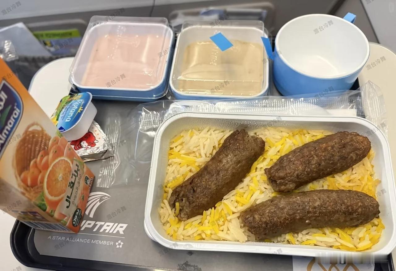 埃及航空的飞机餐,看了就立马使得自己倒胃口~黄白相间的米饭(据说这种双色饭在中东挺常见,是当地特色做法)上,整整齐齐摆着三根像肉肠一样的料理(只是形状太tmd像排泄物),看着很有嚼劲的样子,不知道是牛肉还是羊肉做的,香料味应该很足。旁边两盒盖着透明塑料膜的餐盒,盲猜一盒是带点酸甜口的沙拉,另一盒说是当地的特色酱或者甜品。 还有这盒橙子味的饮料,包装上印着阿拉伯文字和饱满的橙子图案,光看就觉得清爽。不得不说,埃及航空这飞机餐挺有异域感的,卖相上就先抓住眼球了。现在光看图片,你有没有点期待了~
