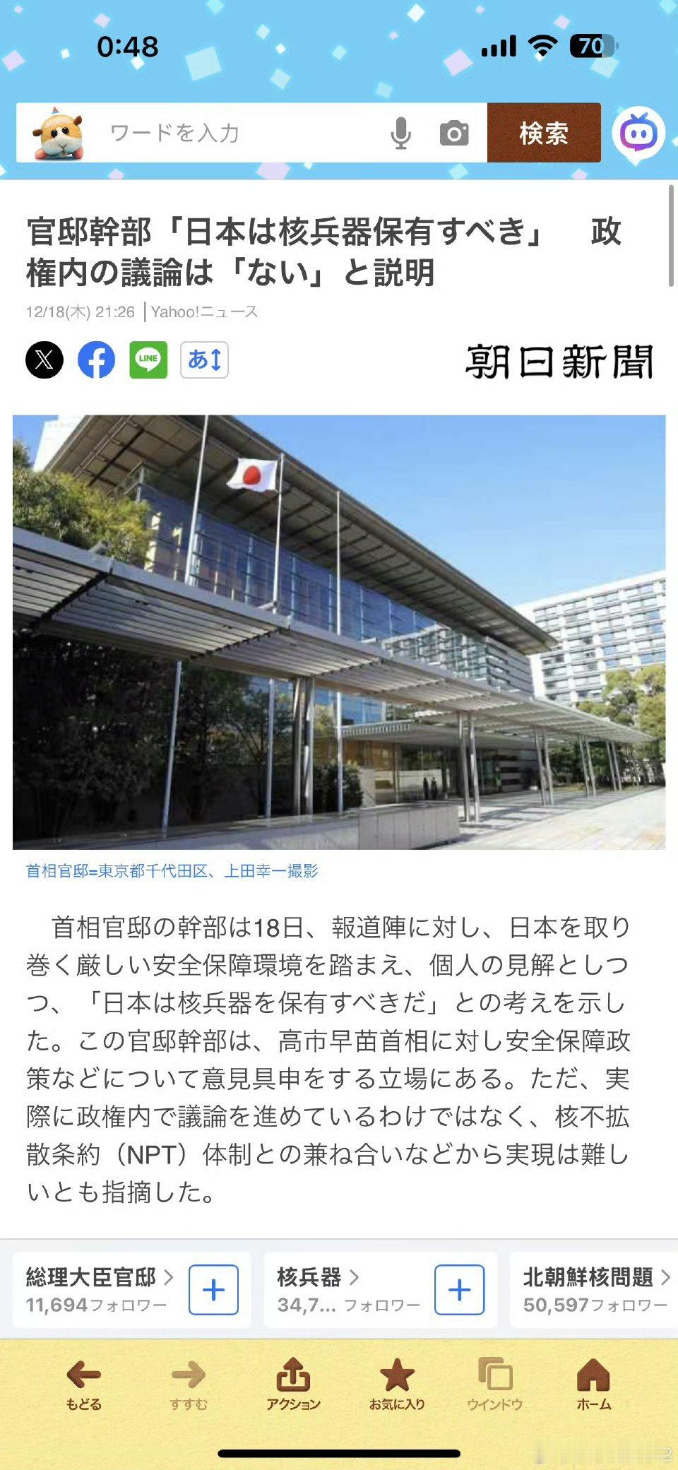 日本都开始讨论搞核武器了……中方代表要求日本立即停止挑衅越线日本高级官员称日本应该拥有核武器朝日新闻报道,12月18号,日本首相办公室一名高级官员接受媒体采访时表示,鉴于日本周围严峻的安全形势,日本应该拥有核武器。热点观点