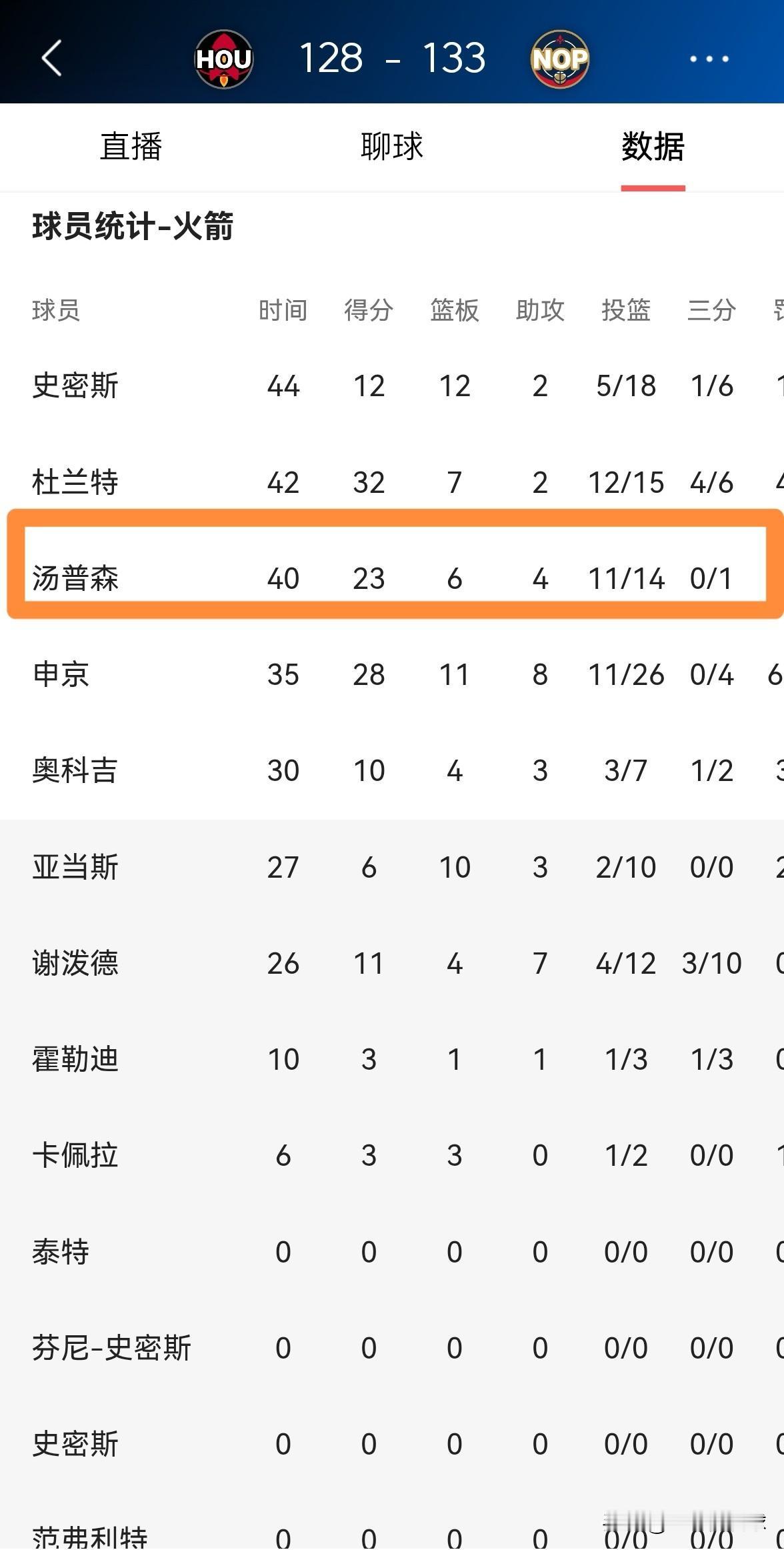 火箭大将阿门-汤普森真是虽败犹荣!虽然今天火箭在客场以128:133不敌鹈鹕,但是阿门-汤普森在攻防两端都打出了具有说服力的表现。 全场比赛下来,阿门首发出战40分钟,投篮14中11,其中罚球1中1极其高效的砍下23分6篮板4助攻1抢断1盖帽。 在我看来,阿门是本场比赛火箭阵中发挥最好的球员之一,可惜的是火箭拥有一个浪投王申京。
