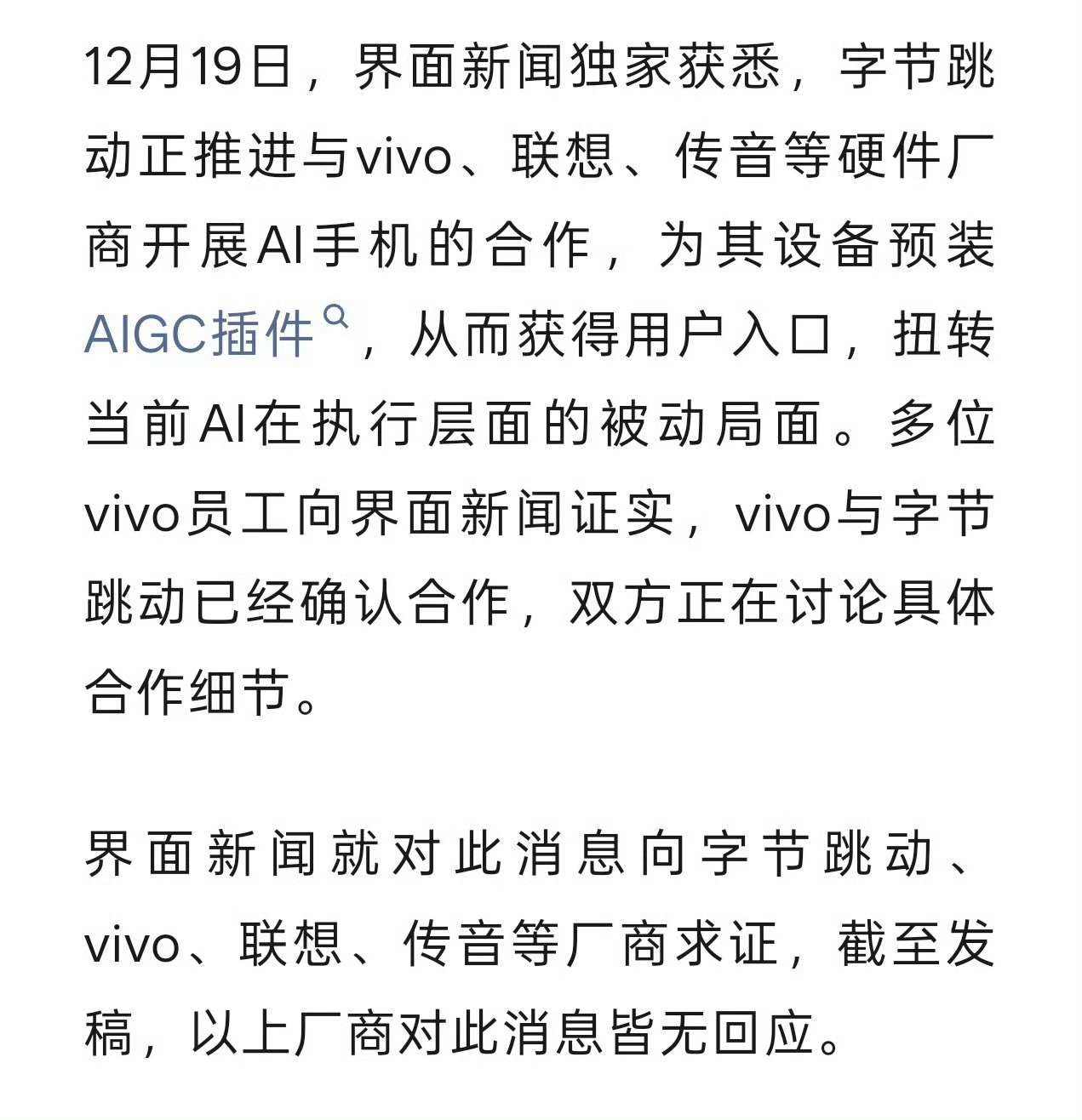 字节跳动正推进与vivo、联想、传音等硬件厂商开展AI手机的合作,为其设备预装AIGC插件,从而获得用户入口,扭转当前AI在执行层面的被动局面。多位vivo员工向界面新闻证实,vivo与字节跳动已经确认合作,双方正在讨论具体合作细节。
