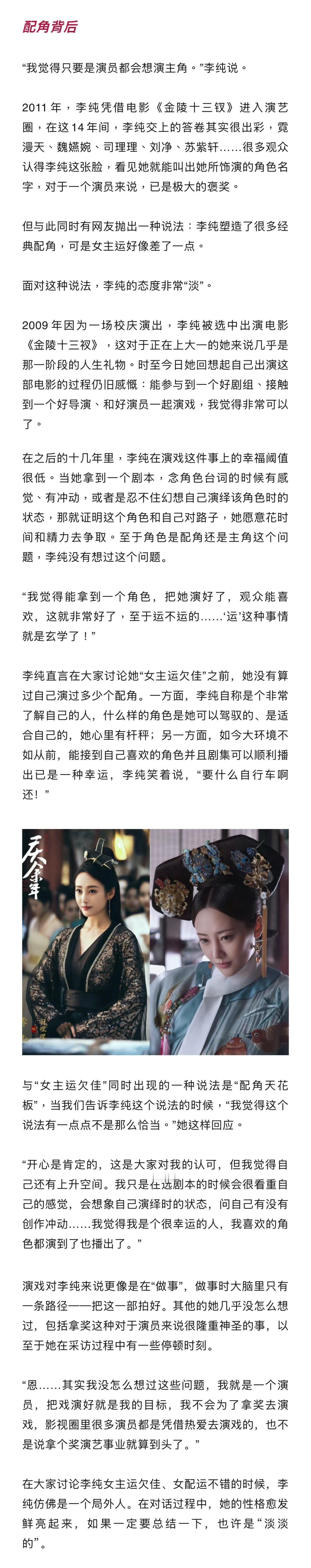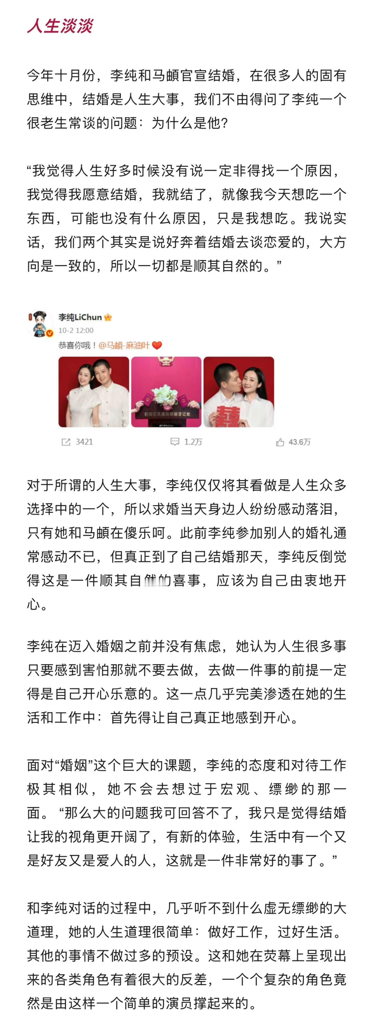 李纯回应女主运欠佳李纯说结婚不需要理由 在《传闻中的她》专访中回应了“女主运欠佳”这个说法,表示在选剧本时不会特意去看是否是主角还是配角,角色有没有人物高光才是更重要的选择标准。个人生活方面,李纯称她与马頔是以结婚为前提的恋爱,两个人顺其自然走进了婚姻,在生活中既是爱人又是朋友,结婚也让她有了更多视角、更多人生体验,更多内容请戳⬇️