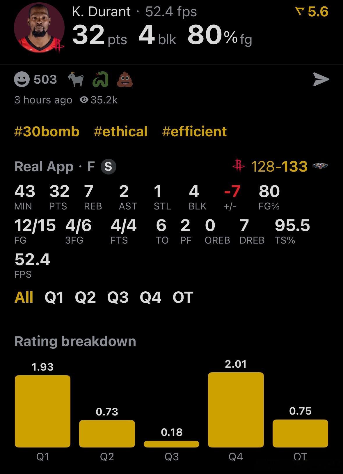 休斯顿火箭 NBA球员评分 杜兰特-我的评分:今天阿杜的进攻效率没话说,15中12三分6中4拿下了:32分 | 7篮板 | 2助攻 | 4盖帽🔥 | 1抢断 | 95.5%TS虽然出现6次失误,但是我觉得被包夹后分球失误不能完全算杜兰特的责任,教练组干嘛去了?明知道会这样,为什么没有针对性的解决方案??其他球员面对这样的情况,怎么落位,谁去接球是不是需要固定下来?休斯顿火箭火箭vs鹈鹕nba趣评分