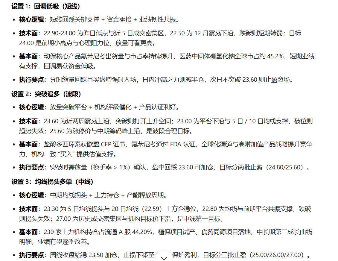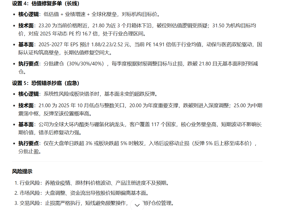 我没有什么提示词,随便找了个股票,只是要求根据基本面和技术面设置一些高概率的交易策略,我一看还挺不错的,基本面虽然简短但要点也提示出来了,对散户应该非常不错注:图一的核心维度要成为提示词,各位参考吧,我感觉总比你瞎几把交易强