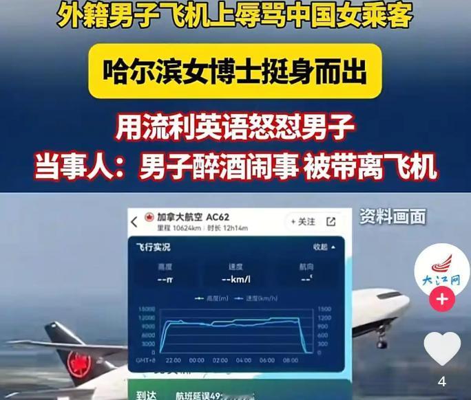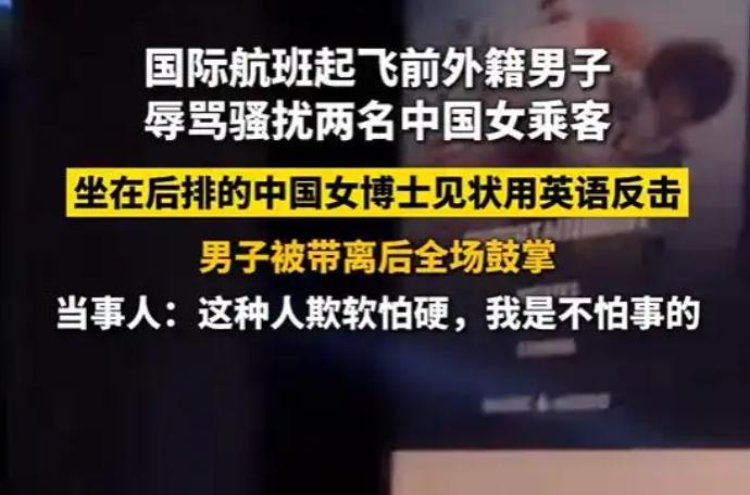 痛快!外籍醉汉欺负中国女孩,90后女博士怒怼,闹事者被赶下飞机全机鼓掌! 12月15日,一架从首尔仁川国际机场飞往多伦多皮尔逊机场的加拿大航空AC62航班上,发生了一件让全机乘客都热血沸腾的事儿,主角是咱们的中国同胞,她们的勇敢举动,简直太解气啦! 当时,飞机上有个外籍男子,坐在前排左侧。一开始,他跟前排右侧的两名中国女子打招呼,本来这也没啥,可谁能想到,他说话声音越来越大,紧接着就开始对着前排中间的女生破口大骂。 那中间的女孩才19岁,正在上大二,哪见过这阵仗,整个人都懵了。右侧那位已经参加工作的女子见状,赶紧帮着挡话,还提议跟中间女孩调换座位,想让这闹剧赶紧平息。 咱们同机的孙女士也看不下去了,好心建议叫空乘来给这男子调换位置。嘿,这男子还真消停了一会儿。 可这消停只是暂时的,没过多久,这男子又开始作妖了。他说话声音再次变得震耳欲聋,嘴里还不干不净地骂着脏话。 这时候,坐在后排的孙女士再也忍不住了,她果断摘下耳机,站了出来。只见她用流利的英语,大声斥责那男子:“你能不能尊重别人,别再骚扰大家了!”那气势,简直太飒了! 这男子哪肯罢休,不仅不收敛,还跟孙女士对骂起来。就在这时,乘务员赶了过来,想解决问题。乘务员好心提醒男子,飞机已经在跑道上准备起飞了,让他别闹了。 可这男子呢,不仅不听劝,还对着乘务员也一顿谩骂。这行为,简直太恶劣了,全机乘客都对他投去了愤怒的目光。 飞机上的气氛瞬间变得紧张起来,大家都担心这男子再闹出什么幺蛾子,影响飞行安全。就在这千钧一发之际,机长果断做出决定,飞机调头回廊桥。 很快,空乘人员就把这男子带下了飞机。当男子被带走的那一刻,机舱里响起了热烈的掌声,大家都为这正义的举动喝彩。这掌声,是对勇敢者的赞扬,也是对恶行的唾弃。 因为这男子的闹剧,航班延误了49分钟,但大家都没有怨言。毕竟,安全才是第一位的,而且看到这样的恶行被制止,大家心里都觉得特别畅快。 飞机终于正常起飞,抵达多伦多后,孙女士把之前录制的视频等证据交给了乘务员。她这么做,就是为了让这男子为自己的行为付出应有的代价。 后来大家才知道,这男子上飞机前就喝了酒,怪不得这么嚣张。而被骚扰的两名女子,一个是涉世未深的大学生,一个是努力工作的职场人,她们本来只是想安安静静地坐个飞机,却遭遇了这样的无妄之灾。 再来说说咱们的孙女士,她是哈尔滨人,在多伦多附近的城市读博士。她自称是个爱管闲事的人,可这“闲事”管得好啊! 她觉得这男子就是欺软怕硬,看到同胞受欺负,她毫不犹豫地就站了出来。她的勇敢,让我们看到了中国人的团结和正义。 在这个事件里,我们看到了恶行的丑陋,也看到了正义的光芒。 孙女士和所有站出来制止恶行的人,都是我们的英雄。 他们用自己的行动告诉我们,面对不公和恶行,我们不能退缩,要勇敢地站出来,维护自己和他人的权益。 让我们一起为孙女士点赞,为所有勇敢的人点赞! 大家对这件事有什么看法呢,评论区说说吧!