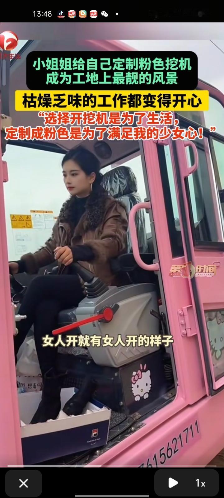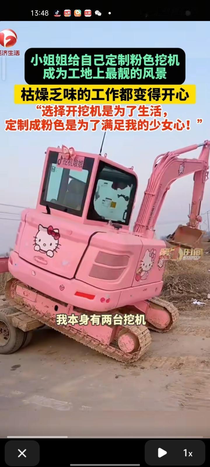 12月18日,菏泽市鄄城县。90后小姐姐给自己定制粉色挖机,成为工地上靓丽的风景线,工人干活的时候看见了就说“你的挖机真漂亮”。 当事人张女士称,自己于19年进入挖机行业,开了有几年了。自己本身有两台挖机,今年准备再买一台,觉得女人要有女人开的样子,定制成粉色是为了满足自己的少女心