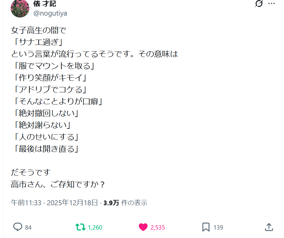 听说在日本女高中生(JK)之间, “太早苗了(サナエ過ぎ)” 这个词正在流行。它的意思是:“用衣服显摆(喜欢通过穿搭压人一头,本次去G20之前的发言)”“假笑很恶心”“即兴发挥时掉链子” (到处计划外的闯祸)“口头禅是‘比起那个(别扯那些)……’”(议会中,野党提问金钱和政治问题,她说别扯这些,搪塞过去)“绝不收回(言论)”(本次对华事件)“绝不道歉”(本次对华事件)“推卸责任(怪罪别人)”“最后反倒理直气壮(耍赖/翻脸不认账)”