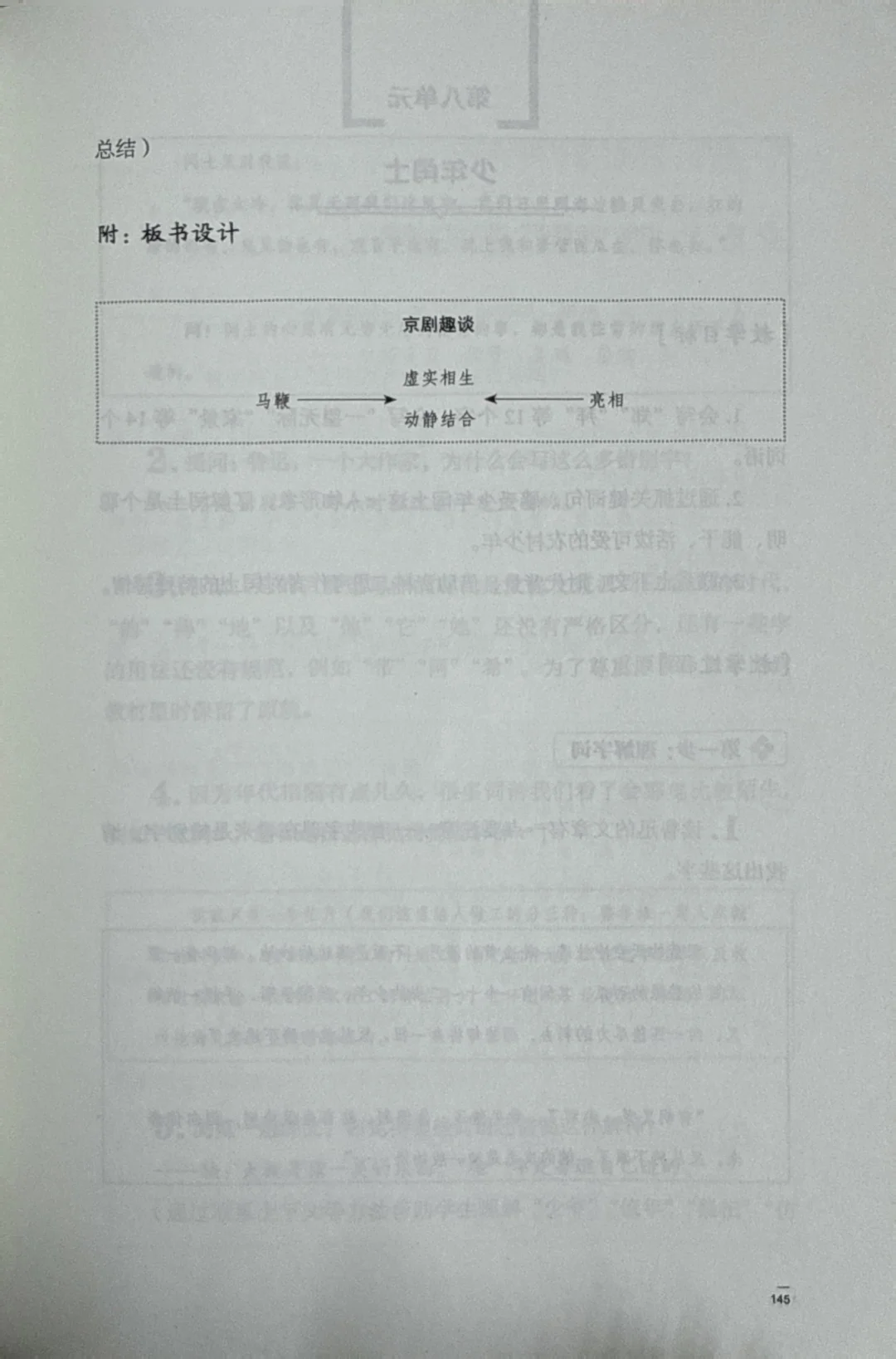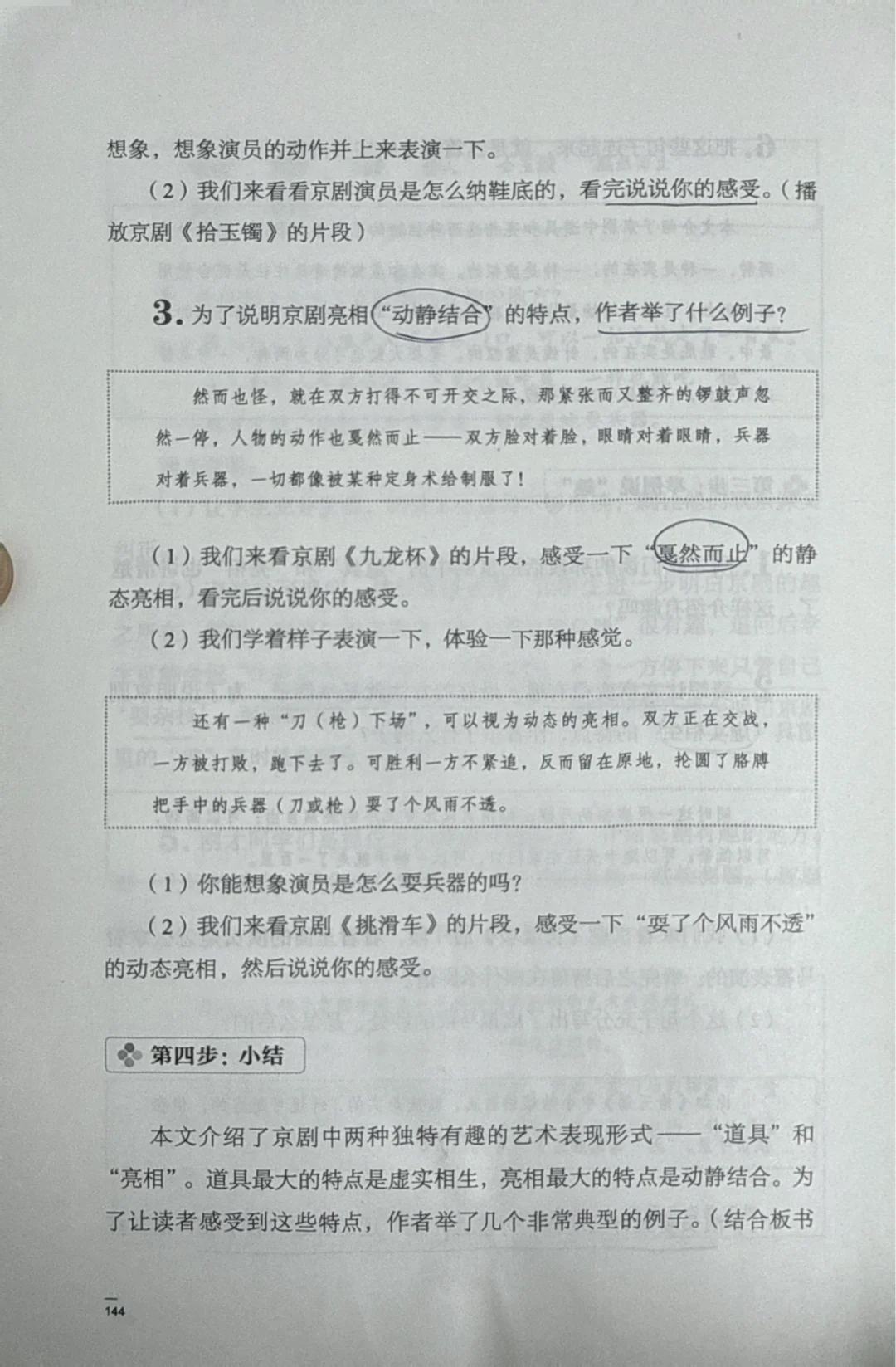 [向右R]本课【教学目标】 [一R]正确、流利地朗读课文,了解京剧艺术中“马鞭”和“亮相”的特点及其艺术魅力。 [二R]能借助语言文字展开想象,感受京剧虚实相生、动静结合的美学原则,体会京剧艺术的独特之美。 [三R]能产生对京剧艺术的兴趣,并乐于与同学交流自己的感受。 【左下方可下载学习单👇】