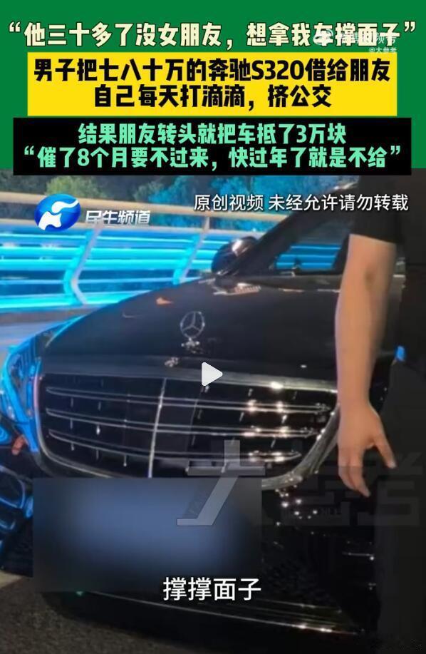 这是真的属于交友不慎、遇人不淑了,换成是我,听到他说“找女朋友、借车充面子”这句话的时候就应该坚决拒绝了,这么爱面子的人,恐怕也不是什么思维理性的人。有多少钱就办多少事,富有富过法,穷有穷过法,借来的奔驰总要还,总要被人拆穿。你说这人啊,到底在虚荣个啥…..80万奔驰借给朋友被抵押男子借朋友80万奔驰抵押3万还债