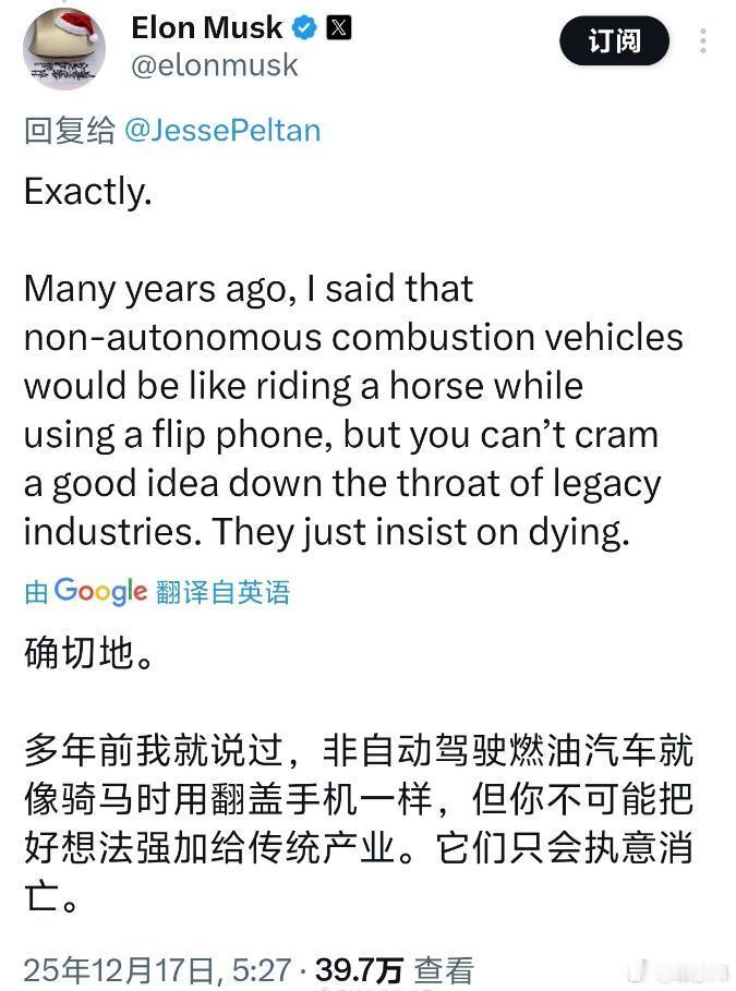 这种话从老马嘴里冒出来,一点都不奇怪,科技狂人往往都有天方夜谭的鬼点子。但他这句话明显就有点王婆卖瓜自卖自夸的味道了,毕竟自动驾驶就是自己的生意。话说,很多国家和地区,连电力供应都不稳定,还奢望什么自动驾驶?一堆丰田破皮卡能开20多年几百万公里,跟自动驾驶确实没半毛钱关系。再者,还是有很多人喜欢人车合一的驾控乐趣的,扯什么自动驾驶都是白搭。老马啊老马,太理想了…..马斯克断言非自动驾驶燃油车终将消亡马斯克最新断言