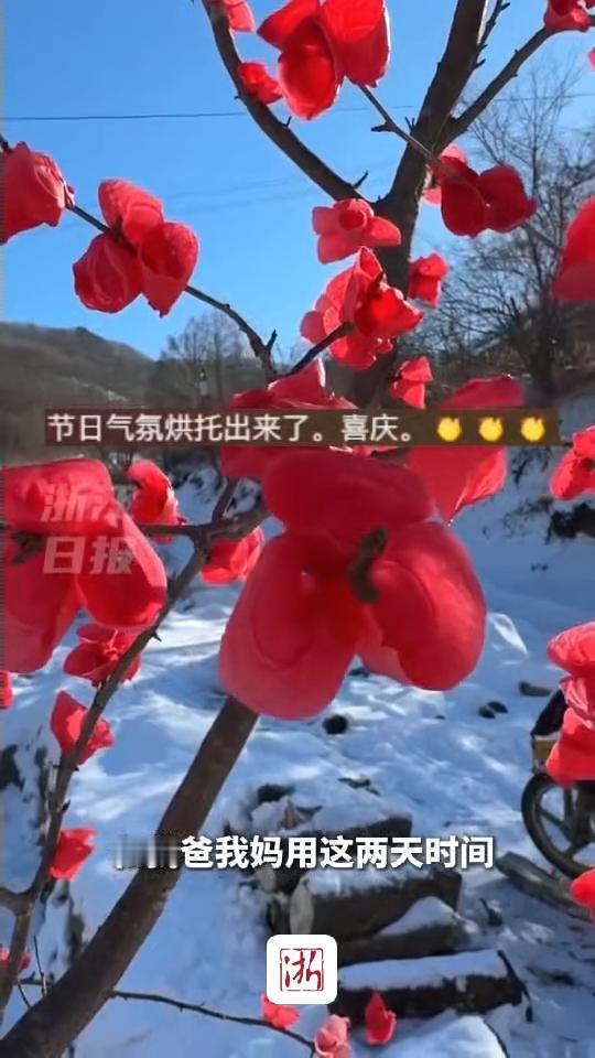 把红蜡和蜡笔融化,三根手指一捏就是花。小伙和爸妈花2天时间做"蜡"梅花,白雪映衬红红的花仿佛闻到了年味。 声音来源:小伙@庆溢在东北。 因为在我小时候,一到冬天家里就开始"猫冬",爸妈就会捏腊梅花去打造一种快过年的氛围,看到"腊梅花"就能想起童年。 做"腊梅花"其实很简单,把红色蜡烛融化了,再加点红色蜡笔,三根手指一捏就是一朵花,固定在树枝上。因为东北的冬天它比较寒冷,不用担心融化,和我爸我妈用这两天时间做出来的"腊梅花"。最后看到一排红红的花朵,仿佛闻到了年的味道,就感觉是亲人在侧,喜乐相伴,日子平淡却温暖。 东北人的冬日浪漫。