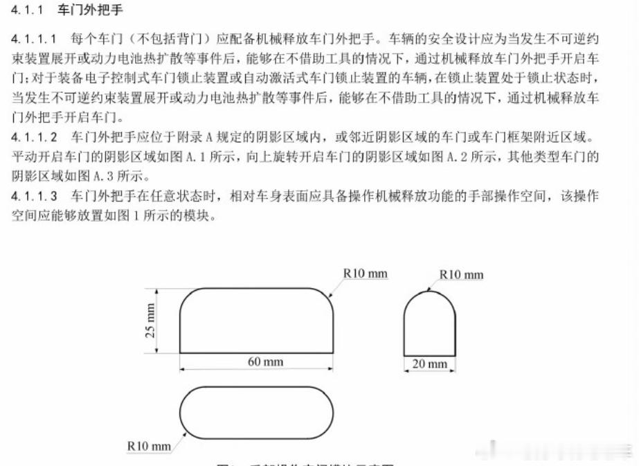 明确禁止全隐藏式门把手 这个必须支持,安全面前,颜值和风阻真的可以往后排~新规明确要求:每个车门(不包含背门)应配备机械释放车门外把手。实施建议时间是2027年1月1日起开始实施,一年的缓冲时间,可能会影响到部分品牌的产品规划了 新能源汽车汽车