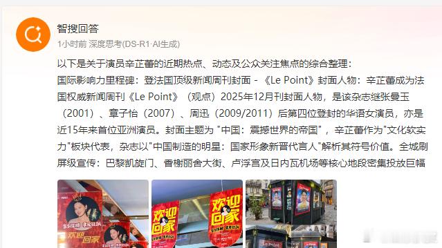 辛芷蕾内娱第四位登观点女演员 辛芷蕾是继张曼玉(2001年)、章子怡(2007年)、周迅(2009年及2011年)后第四位登法国新闻周刊《观点》华人演员,亦是近15年来首位登封的亚洲演员