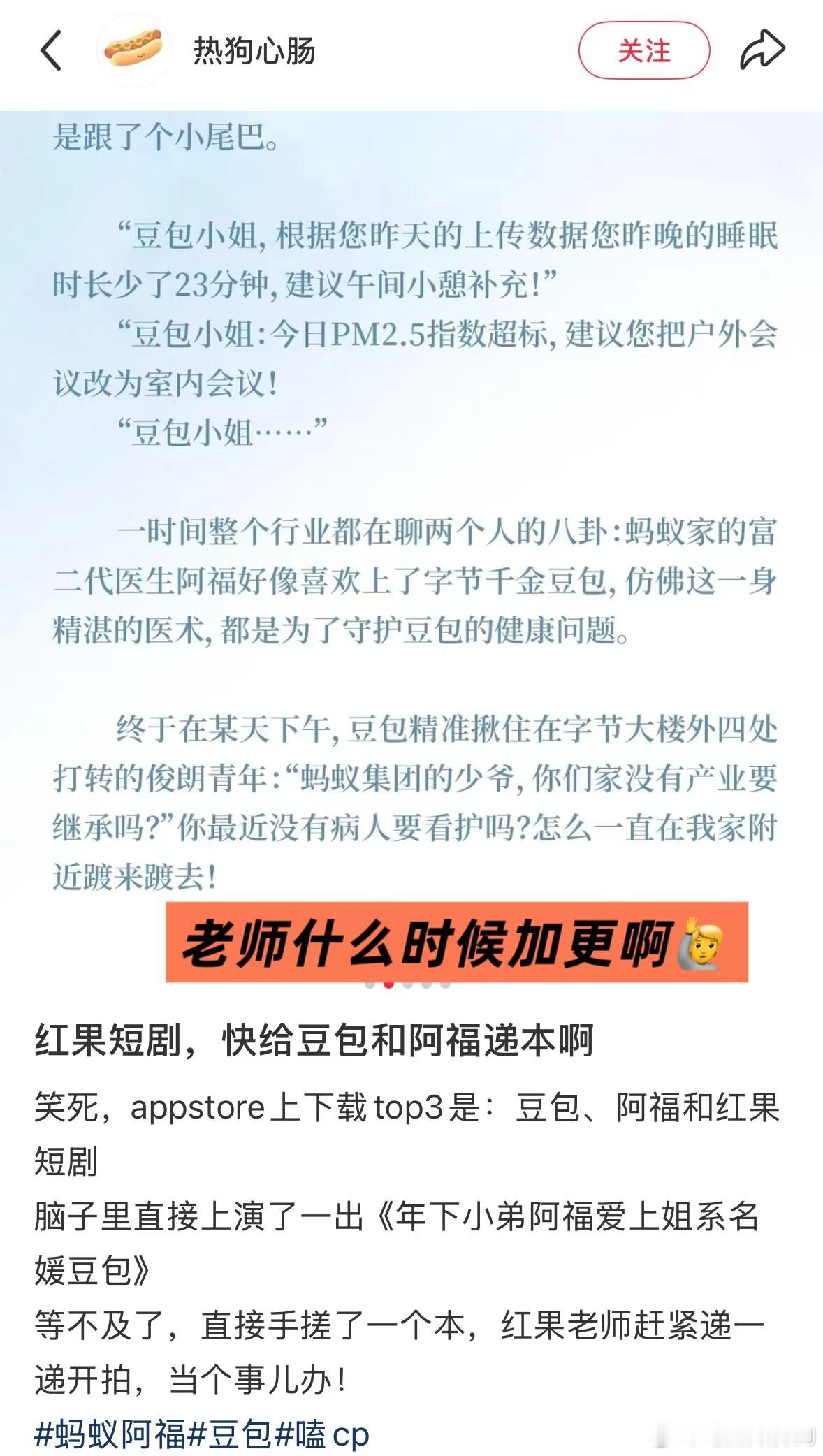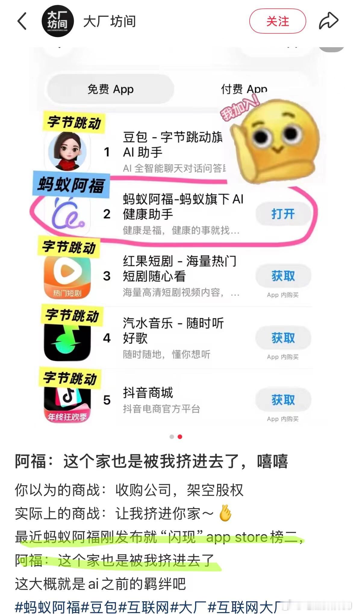 笑薯,关于蚂蚁阿福空降appstore下载量第二名这件事,解读越来越“邪门”了。有网友开始嗑豆包和阿福“年下 doctor爱上字节千金”cp,甚至直接写了一篇同人文喊话红果短剧递本的...还有网友说阿福“破坏”了字节大家庭,本来榜单top5都是字节系产品,阿福突然坐上榜二的位置横插一脚,要我说这哪叫破坏,这明明是加入了这个家。