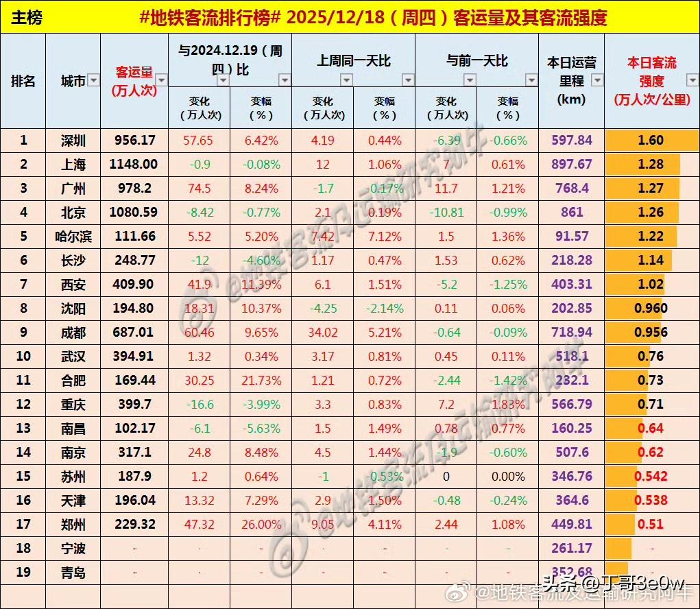 重庆地铁客流量周四399万人次,差一步超400万大关线[呲牙][呲牙][呲牙] 身边事 排行榜 周四 中国地铁客流日报 昨日客流 2025年12月18日 星期④ 全国重点城市轨道交通客流量排行榜: 上海:1148.00万 北京:1080.59万 广州:978.20万广州地铁 深圳:956.17万深圳身边事 成都:687.01万 西安:409.90万西安爆料 重庆:399.70万重庆身边事 武汉:394.91万武汉地铁 南京:317.10万南京地铁 长沙:248.77万 郑州:229.32万郑州爆料 天津:196.04万天津身边事 沈阳:194.80万沈阳铁路 苏州:187.90万 合肥:169.44万合肥爆料 青岛:110万+青岛身边事 宁波:110万+宁波地铁 哈尔滨111.66万 南昌:102.17万