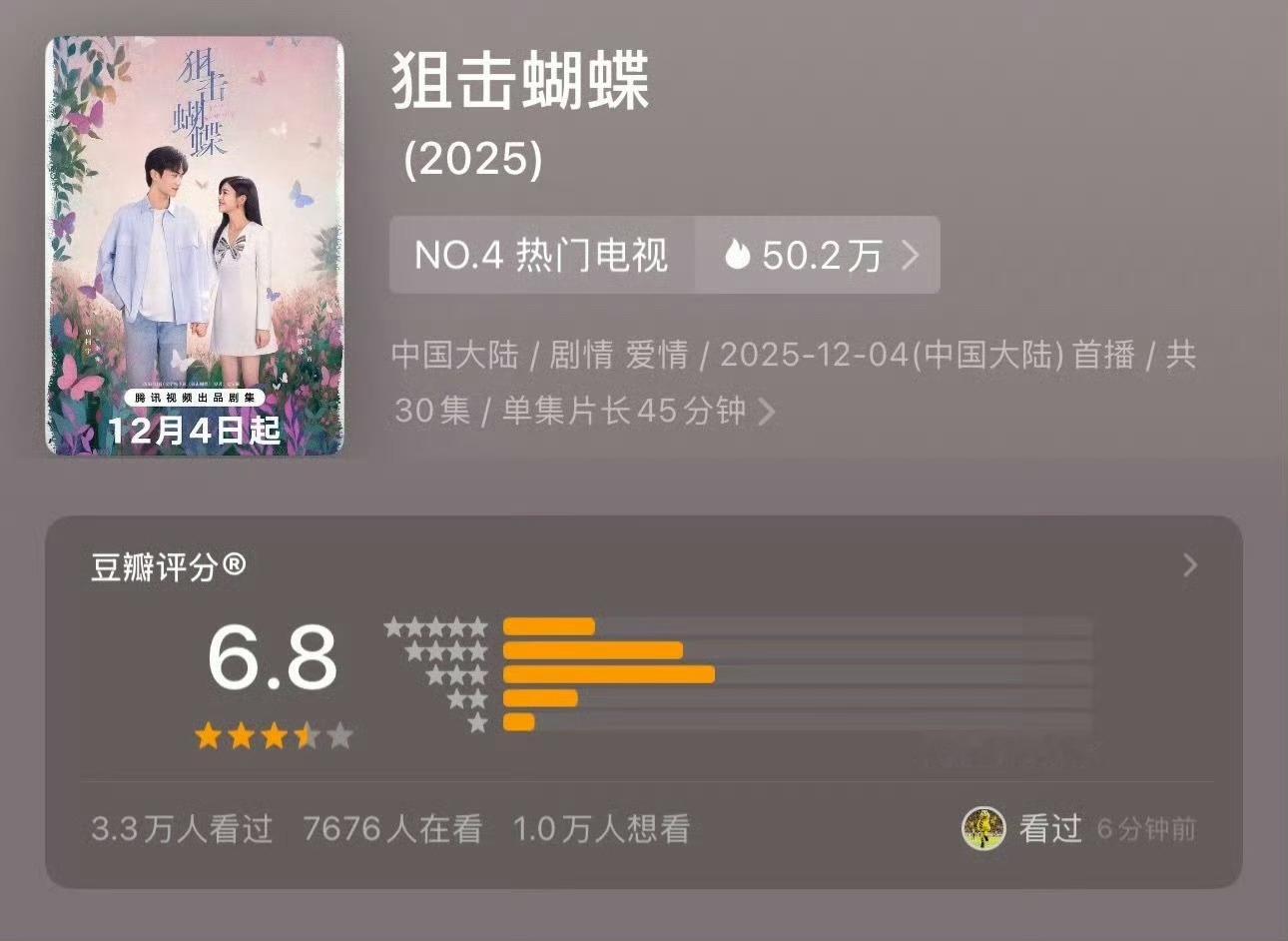 陈妍希周柯宇的《狙击蝴蝶》开分6.8分,高了还是低了?