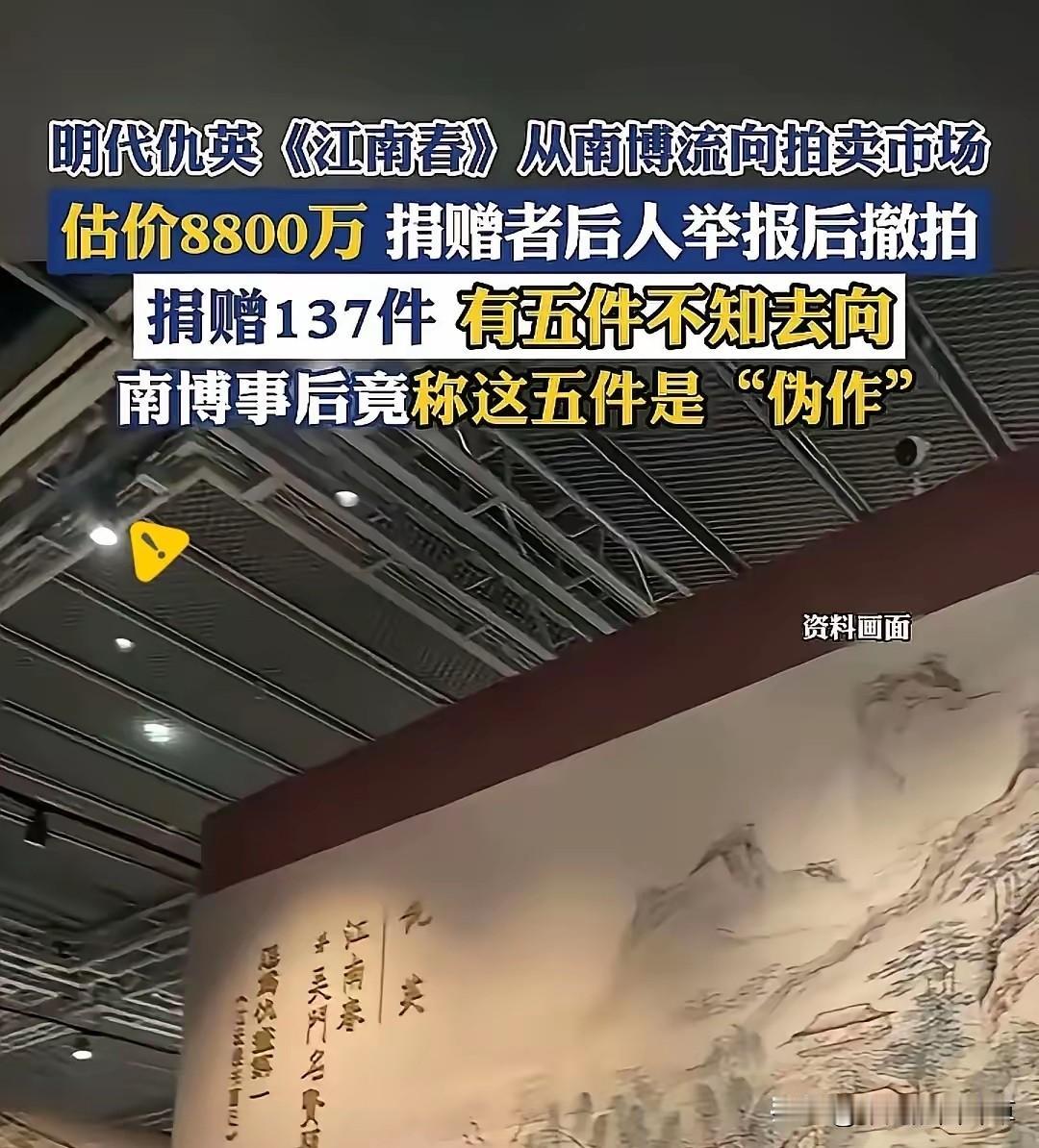 刷手机的时候看到,南京博物院那事儿又上热搜了,越看越让人揪心! 江南收藏大家庞莱臣的后人早年无偿捐了137幅珍贵画作,其中5幅经专家两次鉴定为“伪作”,上世纪90年代按规定处置了。谁能想到,现在其中一幅《江南春》突然出现在拍卖市场,估价直接冲到8800万!更让人意外的是,这幅画当年竟以6800元的价格被“顾客”买走,销售清单只标注了《仿仇英山水卷》。 庞家后人手握捐赠清册、传承印鉴等铁证,坚信《江南春》是真迹,而且博物馆从没就鉴定结果和处置情况告知过他们,现在急得直接起诉,就想查清楚这画到底是怎么流出去的,当年的处置流程到底有没有问题。 目前南博说会配合审理,江苏文旅厅也成立了专班调查,承诺有违规就严肃处理。全网都在盯着这事儿——毕竟是无偿捐赠的宝贝,要是博物馆都管不牢,处置流程不透明,捐赠者的知情权也得不到保障,以后谁还敢把家里的珍藏捐给国家啊?