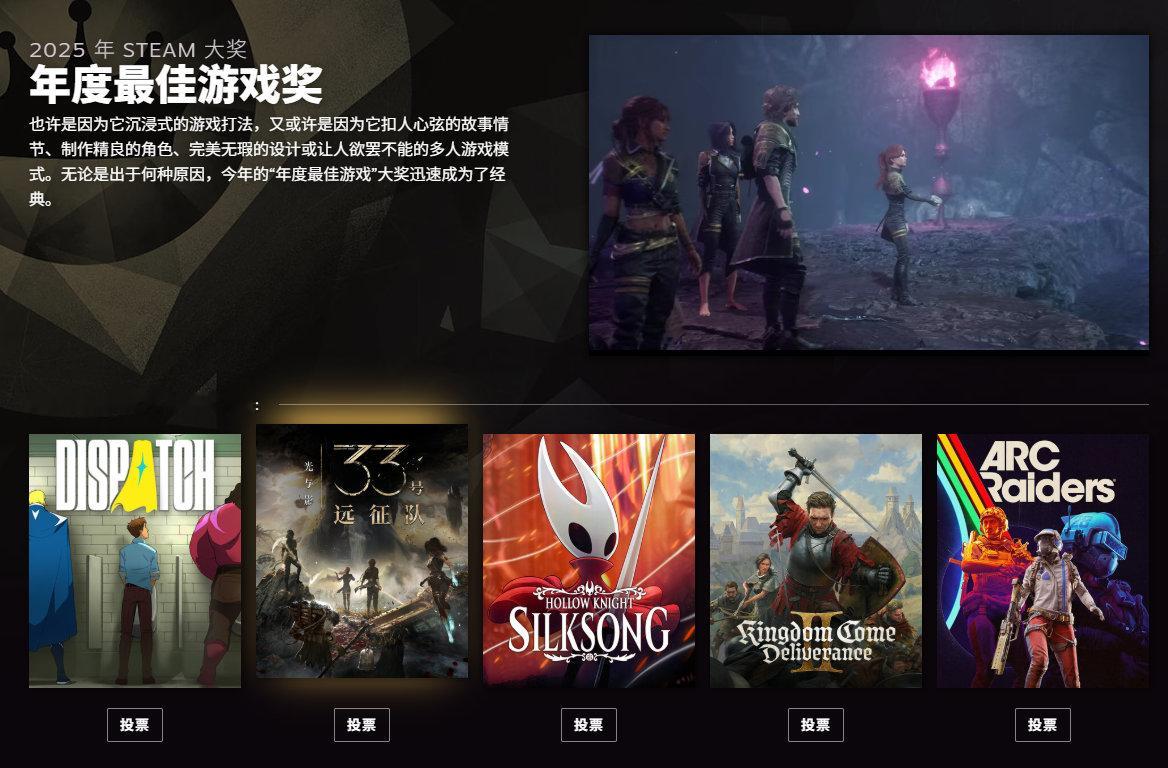 2025年Steam大奖提名公开,投票已开启,北京时间2026年1月4日凌晨两点截止。- 年度最佳游戏·《超英派遣中心》·《光与影:33号远征队》·《超英派遣中心》·《空洞骑士:丝之歌》·《天国:拯救2》·《Arc Raiders》- 年度最佳 VR 游戏奖·《Pavlov》·《Le Mans Ultimate》·《F1 25》·《Emissary Zero》·《午夜漫步》 - 爱的付出奖·《博德之门 3》·《绝地潜兵2》·《腐蚀》·《Dota2》·《无人深空》 - 最佳 Steam Deck 奖·《球比伦战记》·《四叶草深渊》·《Hades 2》·《数码宝贝物语:时空异客》·《深岩银河幸存者》 - 独乐乐不如众乐乐奖·《PEAK》·《双影奇境》·《战地6》·《Schedule I》·《R.E.P.O.》 - 杰出视觉风格奖·《寂静岭f》·《ENA: Dream BBQ》·《最终幻想7:重生》·《我的小柯基》·《毁灭战士:黑暗时代》 - 最具创意游戏奖·《蓝途王子》·《逃离鸭科夫》·《Mage Arena》·《欧陆风云5》·《Arc Raiders》 - 纵使手残仍大爱奖·《艾尔登法环:黑夜君临》·《漫威争锋》·《空洞骑士:丝之歌》 - 最佳原声音轨奖·《首都高赛车》·《光与影:33号远征队》·《节奏裂隙》·《漫威蜘蛛侠2》·《三角符文》 - 杰出剧情游戏奖·《超英派遣中心》·《最后生还者2:复刻版》·《寻找伪人》·《天国:拯救2》·《消逝的光芒:困兽》 - 轻松惬意奖·《Megabonk》·《史莱姆牧场2》·《冲就完事模拟器2》·《放松时光:与你共享Lo-Fi故事》·《我们到了吗?》