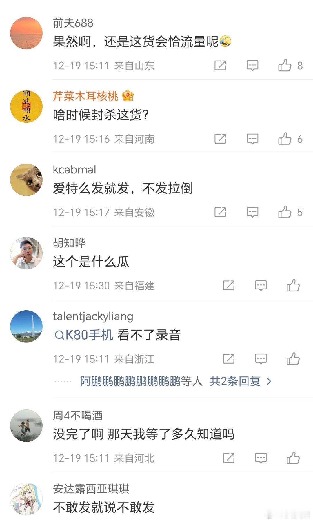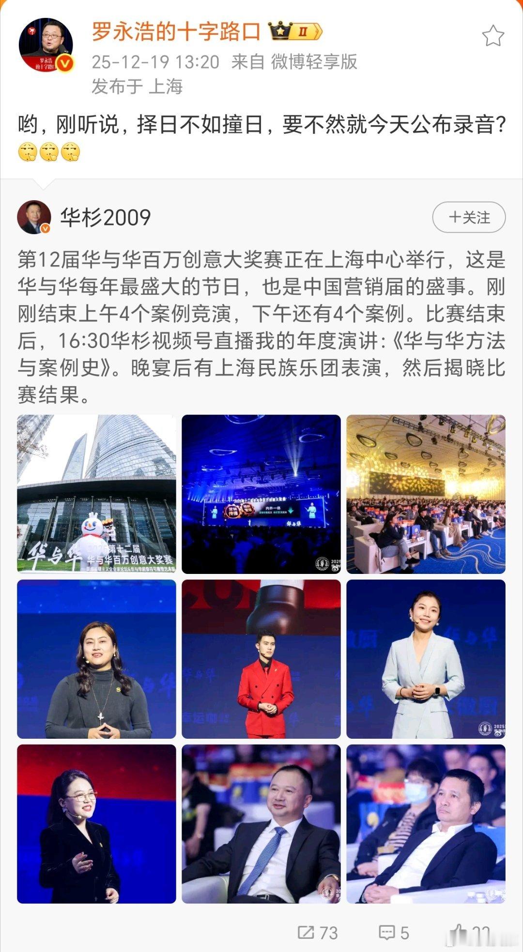 罗永浩问要不今天公布录音12月19日,华杉发文宣传华与华年度演讲,随后罗永浩转发表示:“哟,刚听说,择日不如撞日,要不然就今天公布录音乐。”看来罗永浩这是要和华与华硬刚到底啊!网友评论:果然啊,老罗是懂怎么恰流量的;不敢发就说不敢发。还有不少网友建议封杀罗永浩罗永浩痛批电信宽带缩水科技先锋官