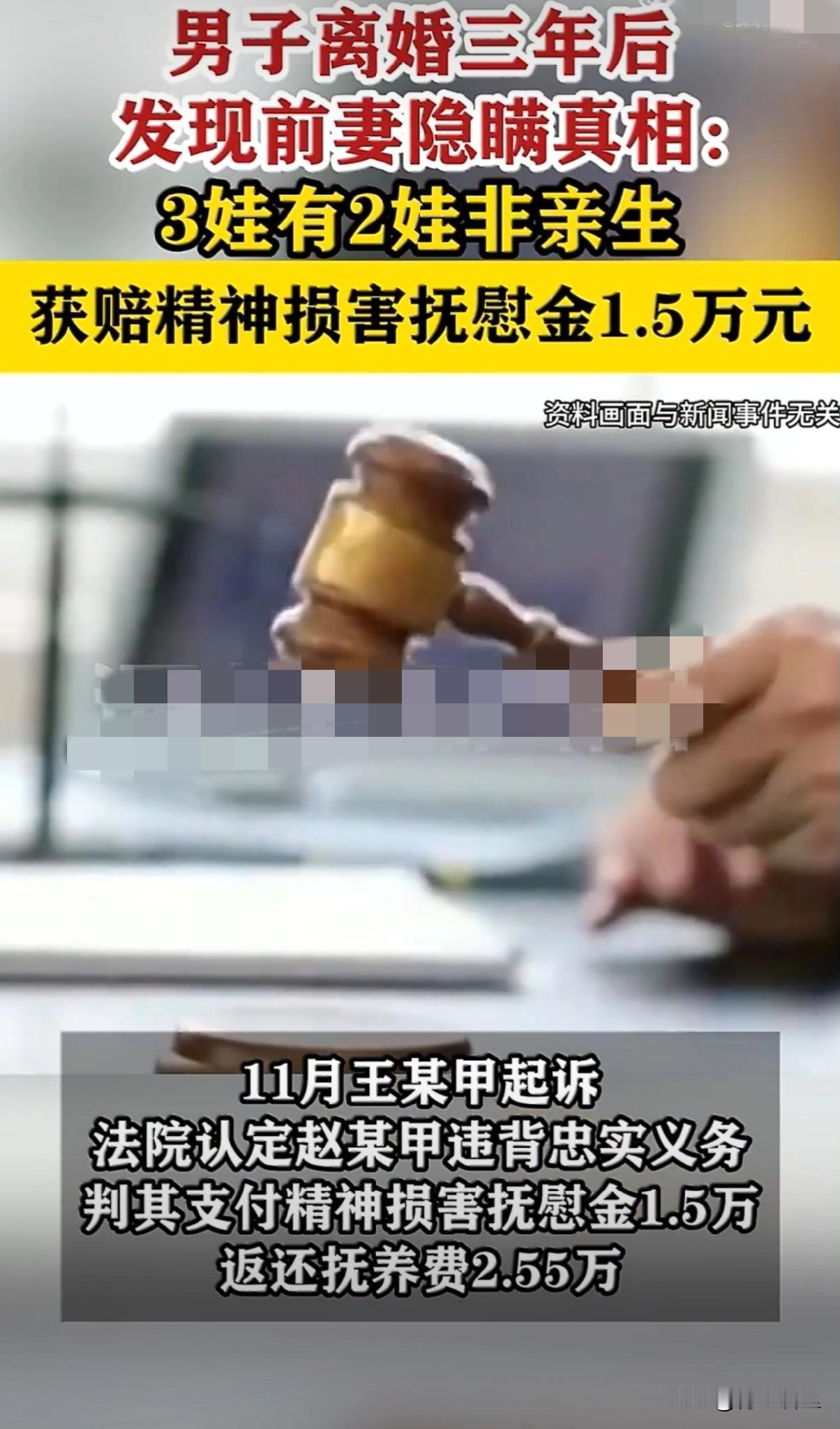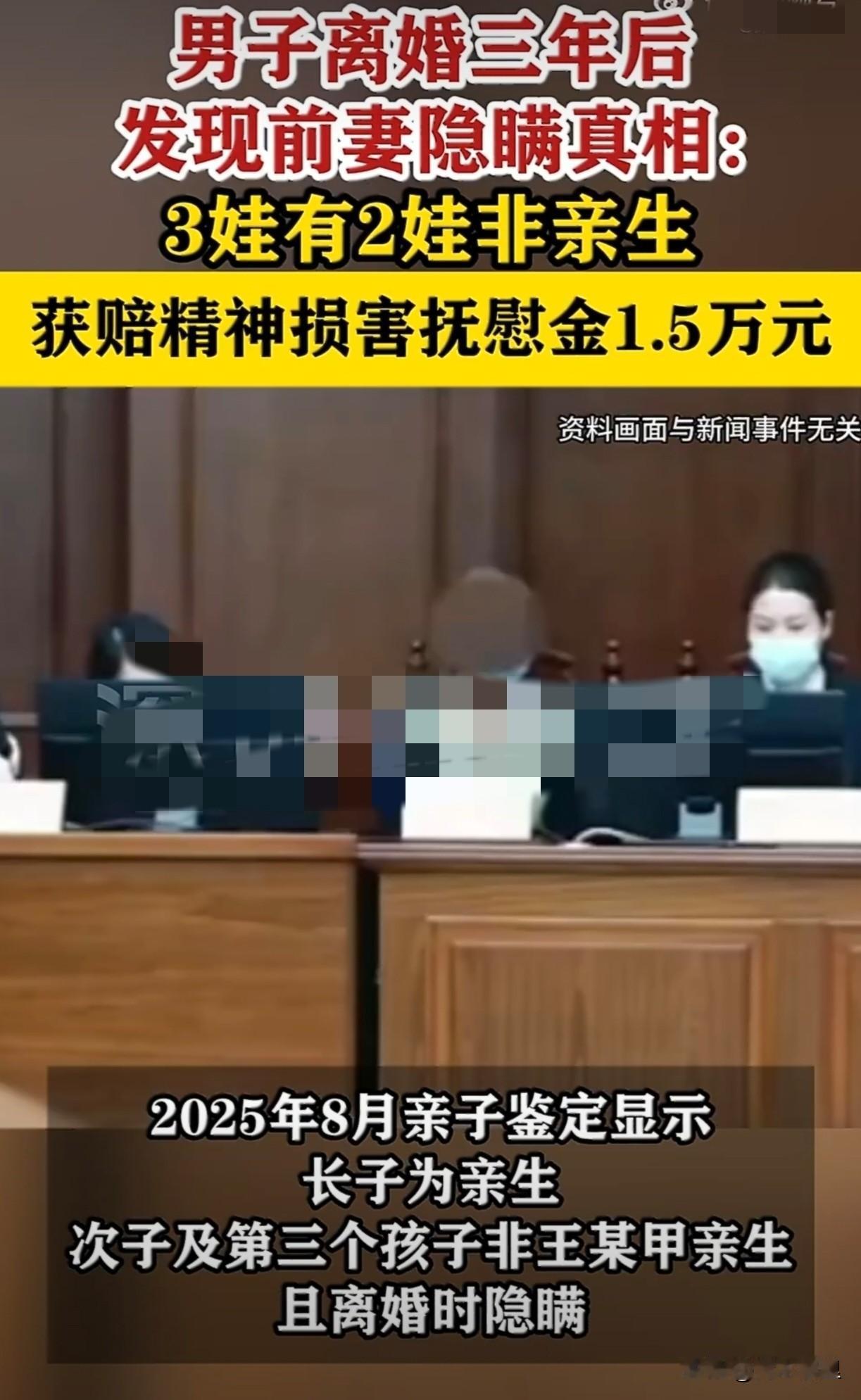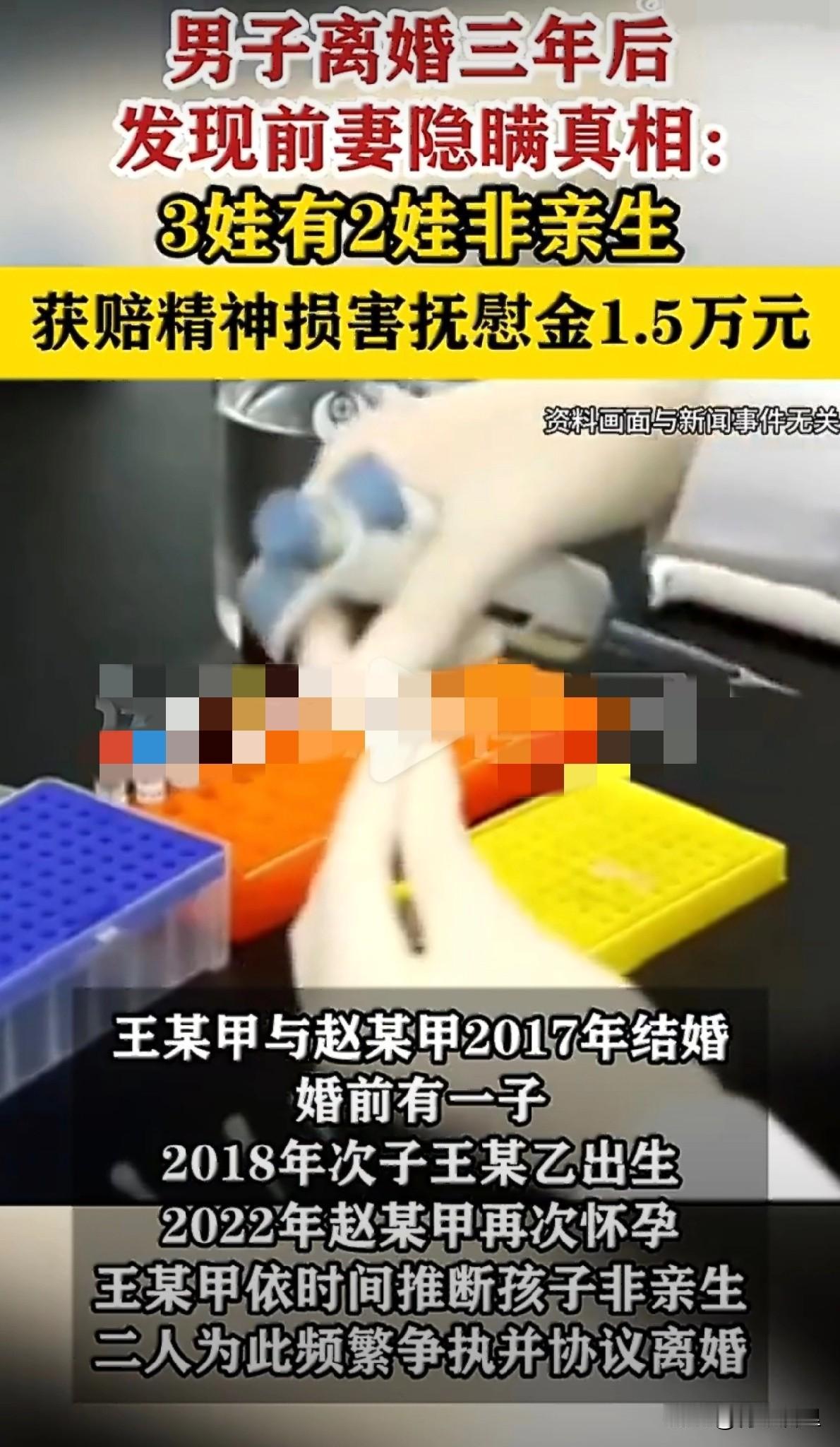 看到一个新闻,说实话,个人觉得男的挺惨。云南的一男子王某和女子赵某在2017年结婚,婚前已经有一个孩子了。2018年次子出生,2022年妻子又怀孕了。王某算了算时间觉得不对,认为第三个孩子不是自己的,两人频繁吵架,最终离婚,妻子当时自愿放弃了所有财产。 2025年的时候,王某的疑虑未消,于是带俩孩子去做了亲子鉴定,结果如晴天霹雳,这两个孩子里,只有老大是亲生的,次子也和他没有血缘关系。王某一怒之下,将赵某告上了法庭。法院最后判决前妻赔偿精神损失和抚养费共4万多。 一段婚姻,两次欺骗。最可怕的不是分开,而是我真心对你,你却骗了我两次。得亏王某机灵,不然的话,怕是要蒙在鼓里一辈子了。婚姻 情感