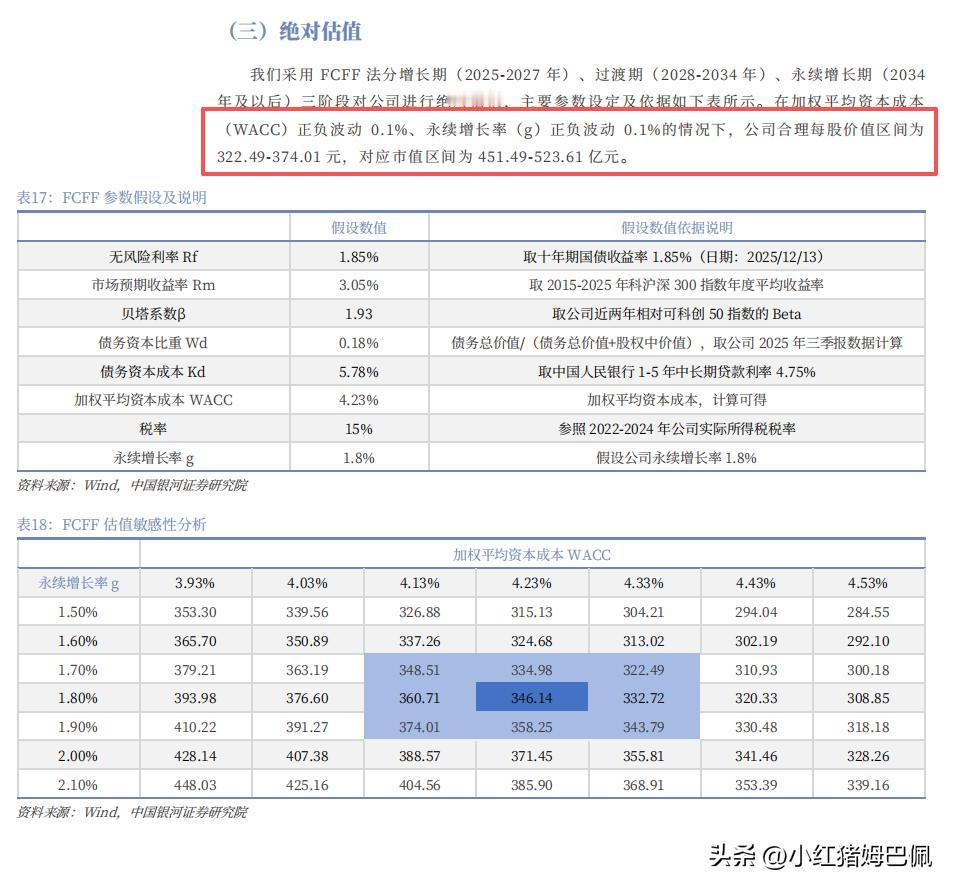 哪家公司我不具体说了,说太明晰和直白,可能平台会判定不合规,也不排除别有用心的人按XXX来举报。 我再分享一下的用意有两个:一是再感谢一些我的忠实粉丝,当时我提这个标的的时候价格是170,4个月左右现价220元左右,同时机构的目标价定在了322-374元区间,忠实粉丝会知道我说的是哪个公司;二是想借助图里的数据和案例,再度重申和强调我一直所强调的,那些拍脑袋定未来增长的自媒体,那些都是定量分析没有任何定量分析内容的自媒体,那些只永远说银行号说科技不行的自媒体,都是不严谨不科学不值得去看的。专业的机构和负责任的调研有模型,有方法,有数据,并且对于情景假设和关键变量,锱铢必较,这样才能让我们的投资业绩长青。 当然,如果你要说你不管,投资就是不看学历不看背景高手在民间、投资就是不用看财务报表管那么细,投资就是收股息,OK,那你就是对的!我没意见!