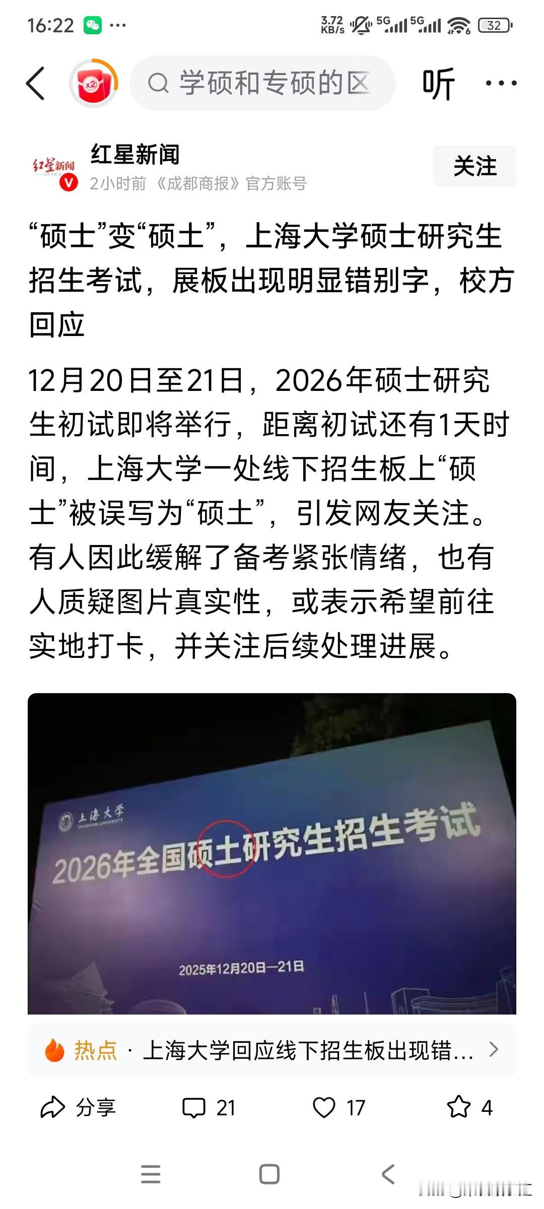 全国硕士研究生招生考试,竟然被上海大学展板上误写成“硕土”考试。 简直太让人无语了,也太搞笑了。 难道硕士研究生毕业以后都预示着要吃土吗?这是上海大学对研究生的出路,提前做出了预测吗? 这个不应该出现的错误。引来了很多网友的评论。 这也是继上海交通大学宣布招生5000名博士生之后的又一大笑柄。 现在高校的硕士生和博士生还值钱吗? 如果遍地都是硕土,就真的那么好看吗?上海大学考研 上海大学考研 上海高校硕士 上海交大硕士 上海考研费用 上海交大复试 上海mba报名