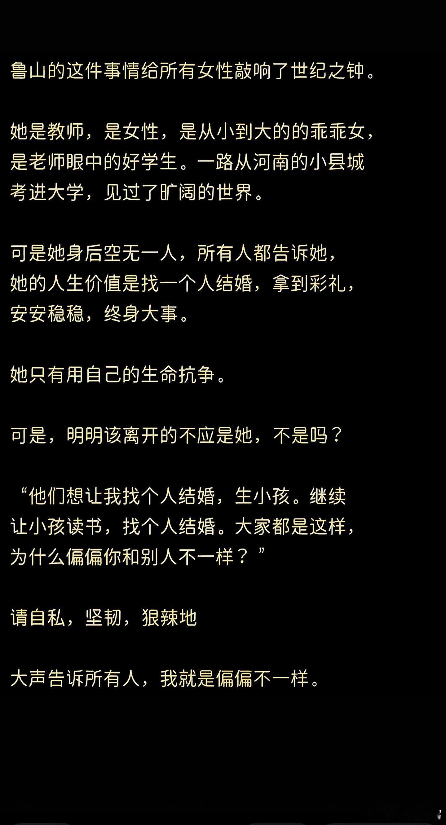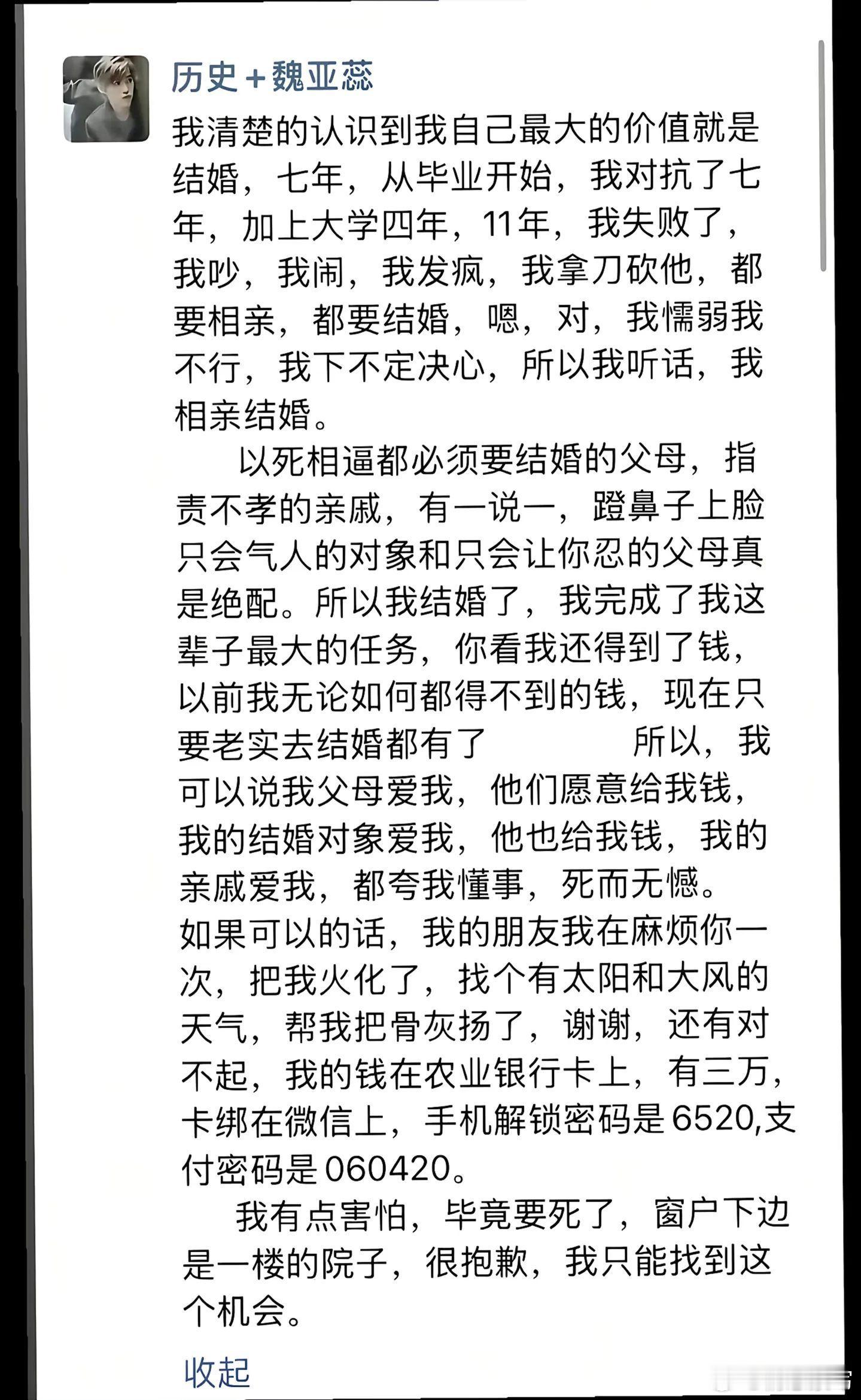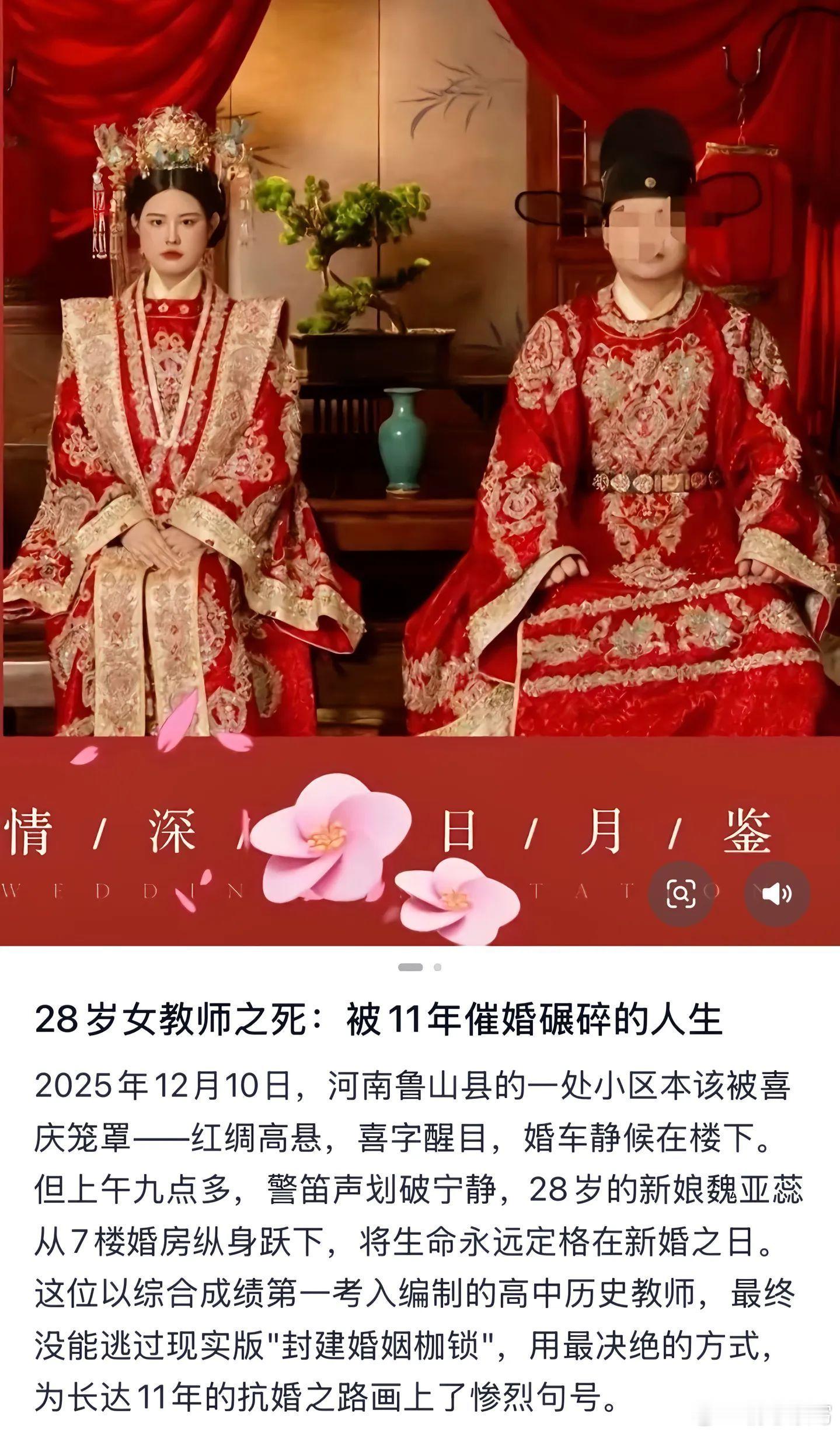 河南女教师新婚日自杀一夜之间天塌了,满屏都是28岁高中女教师结婚当天跳楼,没想到我鲁山以这种方式上了热搜,更没想到我们会以这种方式认识你,希望所有女孩子都可以不用被迫以这么惨烈的方式守护自我,父母千万不要逼着自己的孩子去选择不喜欢的人,让她有自己的选择。