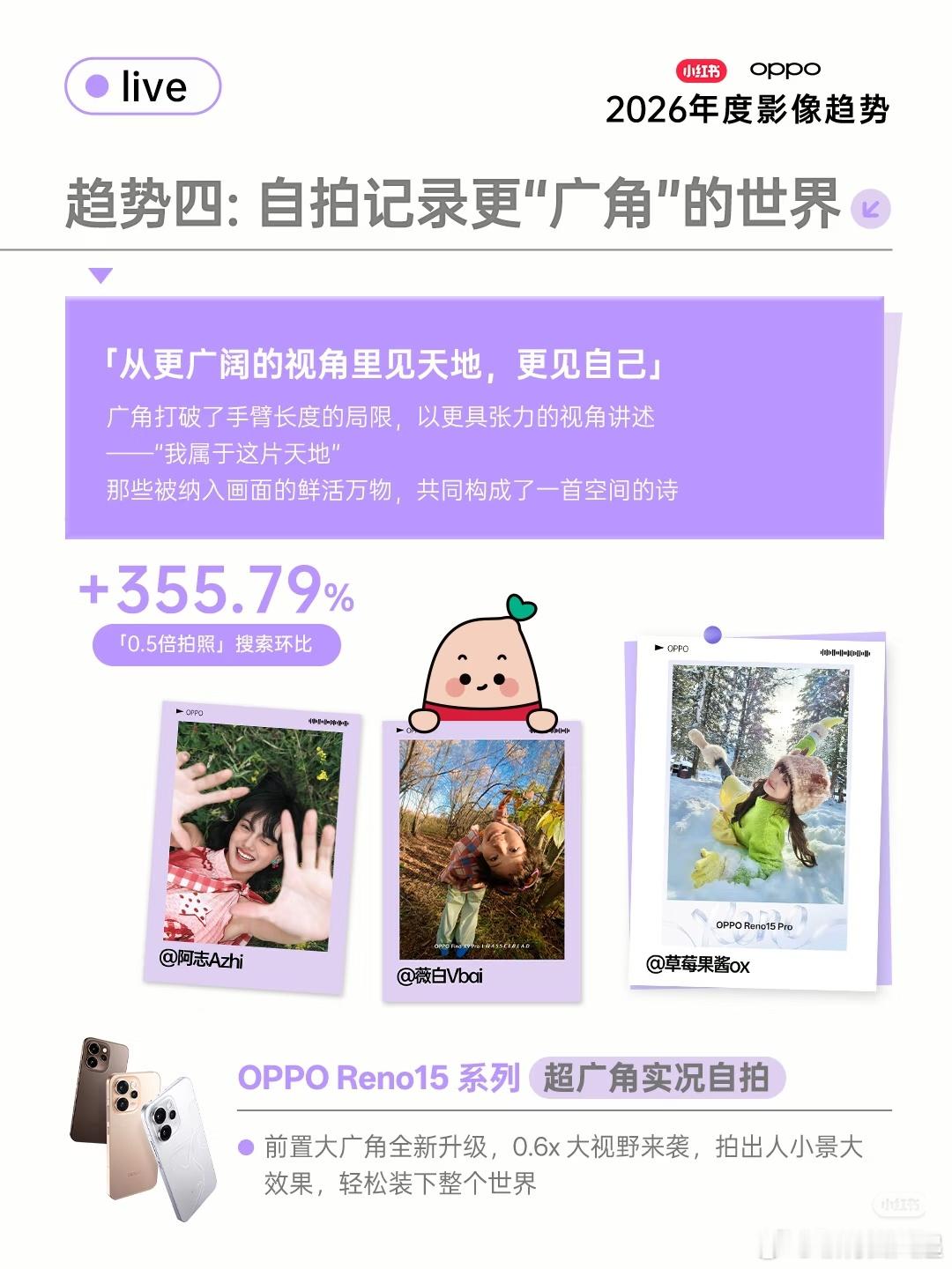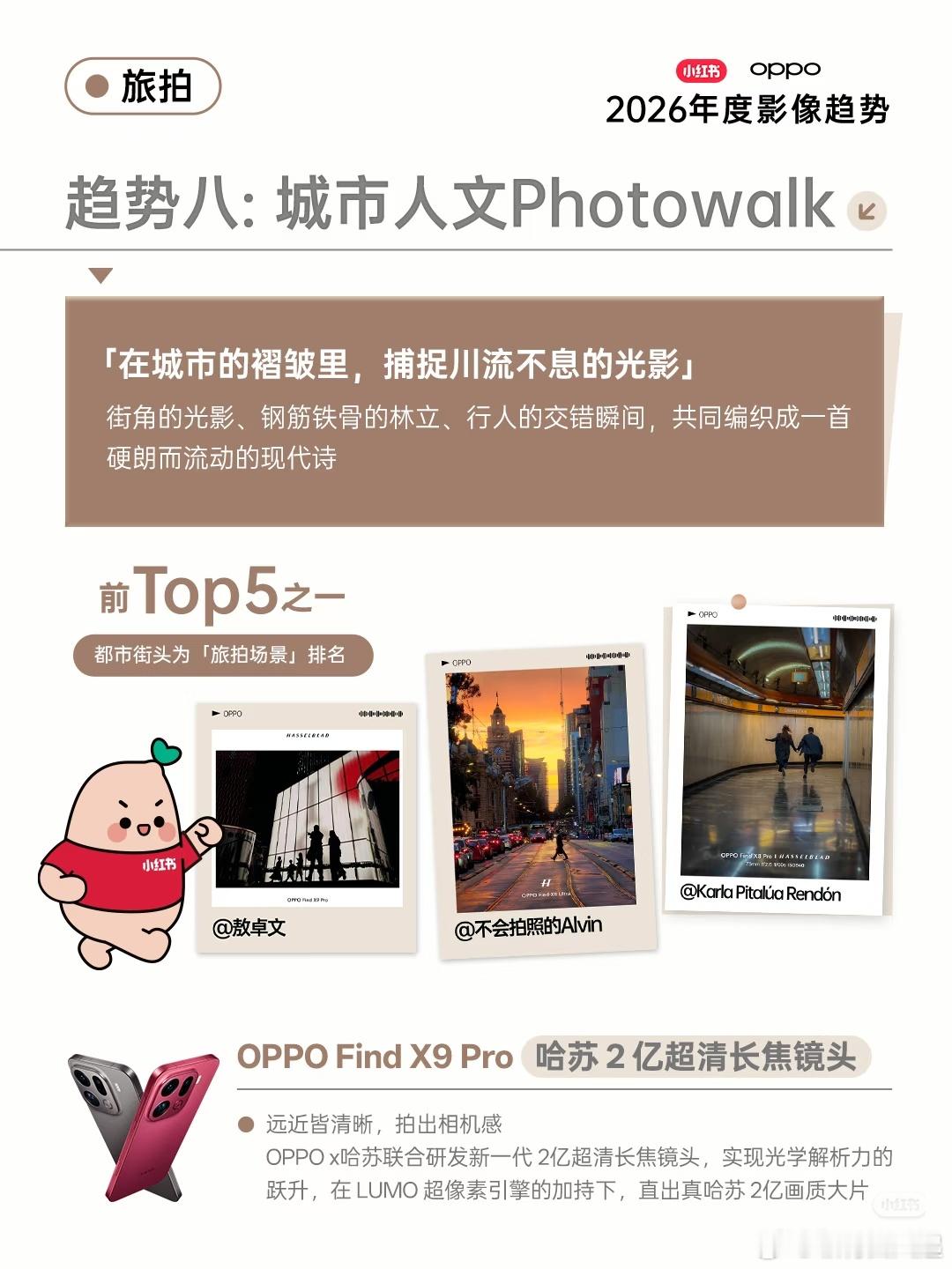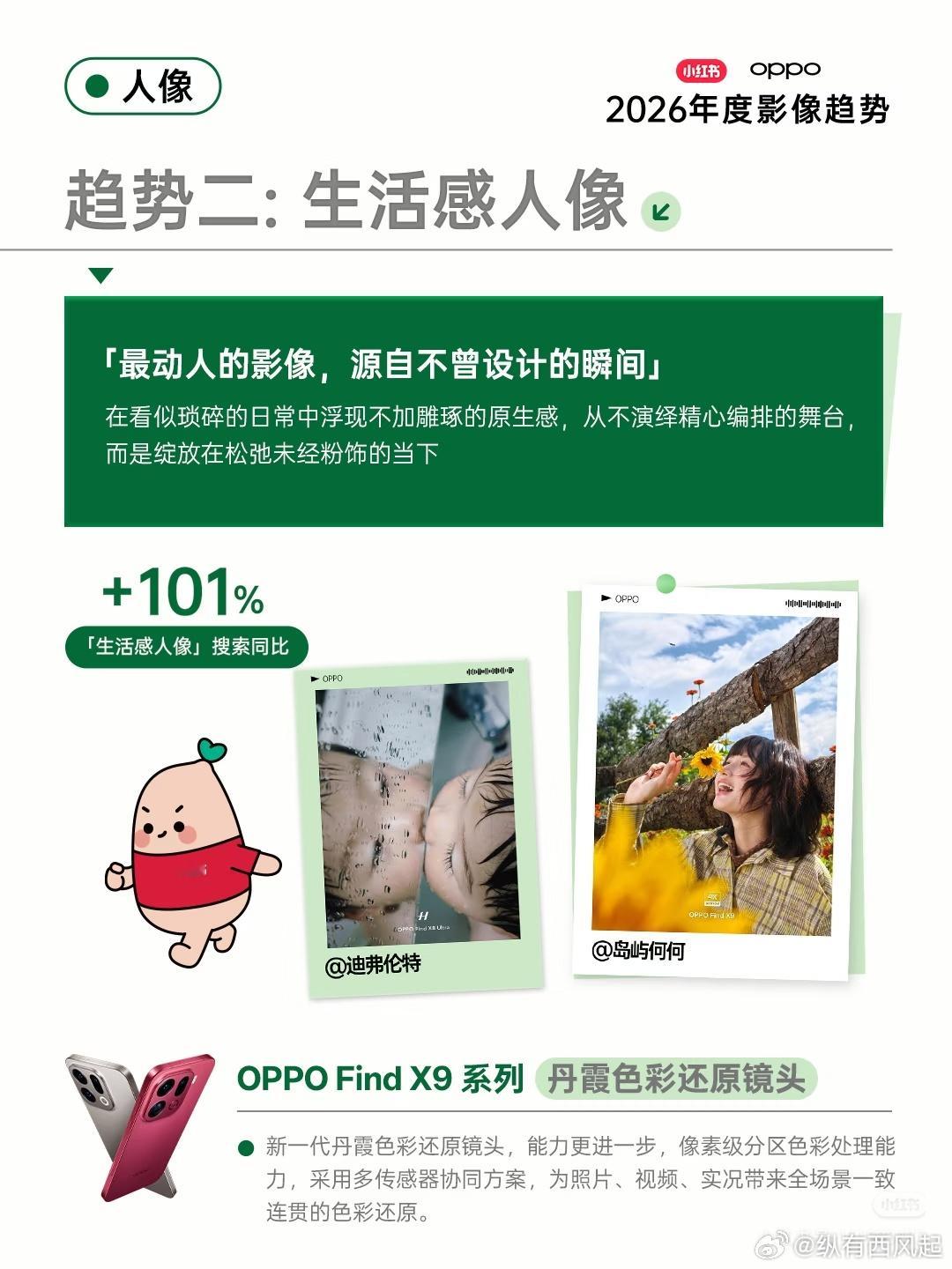 📢OPPO ✘ 小红书 2026影像趋势官宣!OPPO携手小红书,共同揭晓2026年度9大摄影趋势,覆盖人像、Live、旅拍三大场景:人像质感大片❶胶片人像❷生活感人像❸氛围感人像捕捉尽兴瞬间❹自拍记录更“广角”的世界❺会呼吸的live照片❻自由感群像记录旅途时刻❼旅行Vlog❽城市人文Photowalk❾人景合一 哈苏自然色彩
